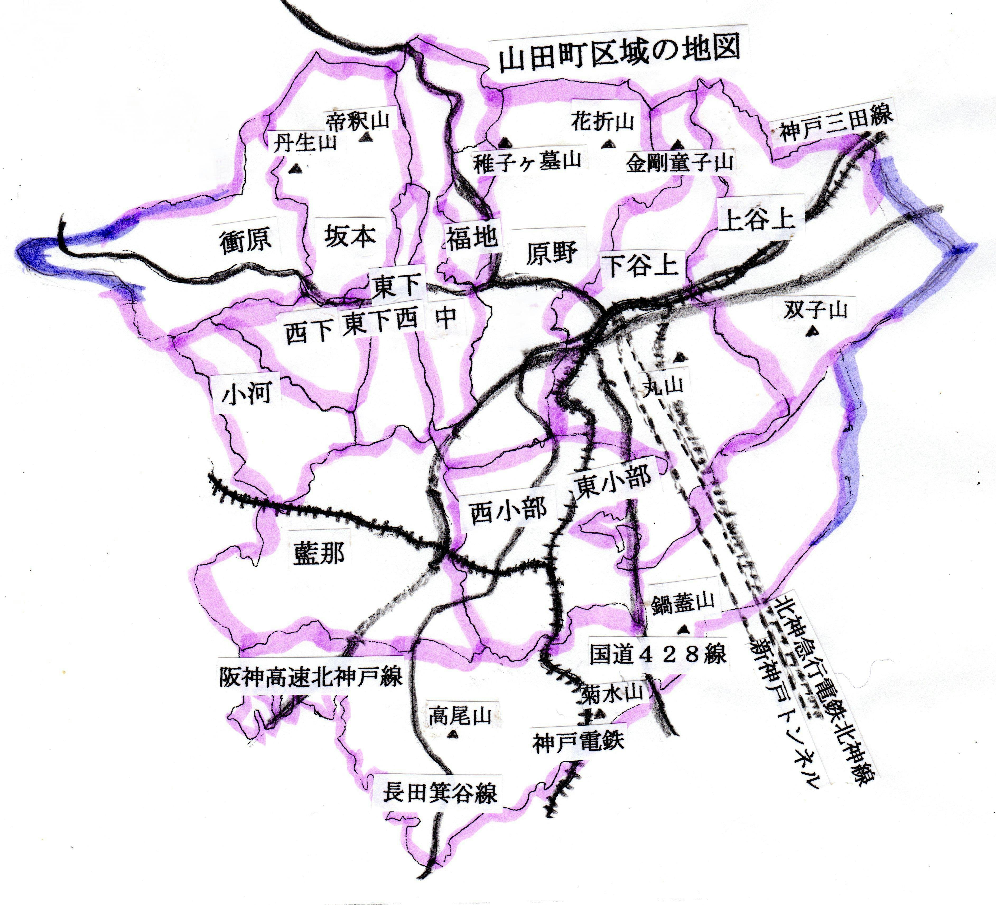(下の地図は摂津国丹生山田庄13ヶ村時代の村名を投影したもの)