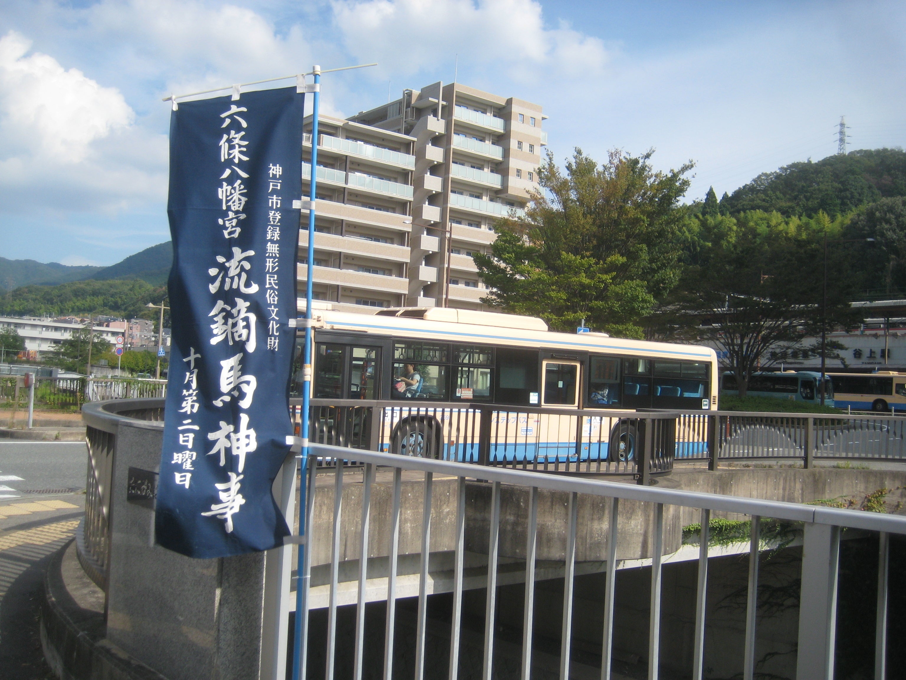 10月13日(日)六條八幡宮(山田町中)では下谷上地区が当番となって、勇壮な流鏑馬神事が開かれます。駅前には幟旗が立てられ、祭りを盛り上げています。楽しみにしています。