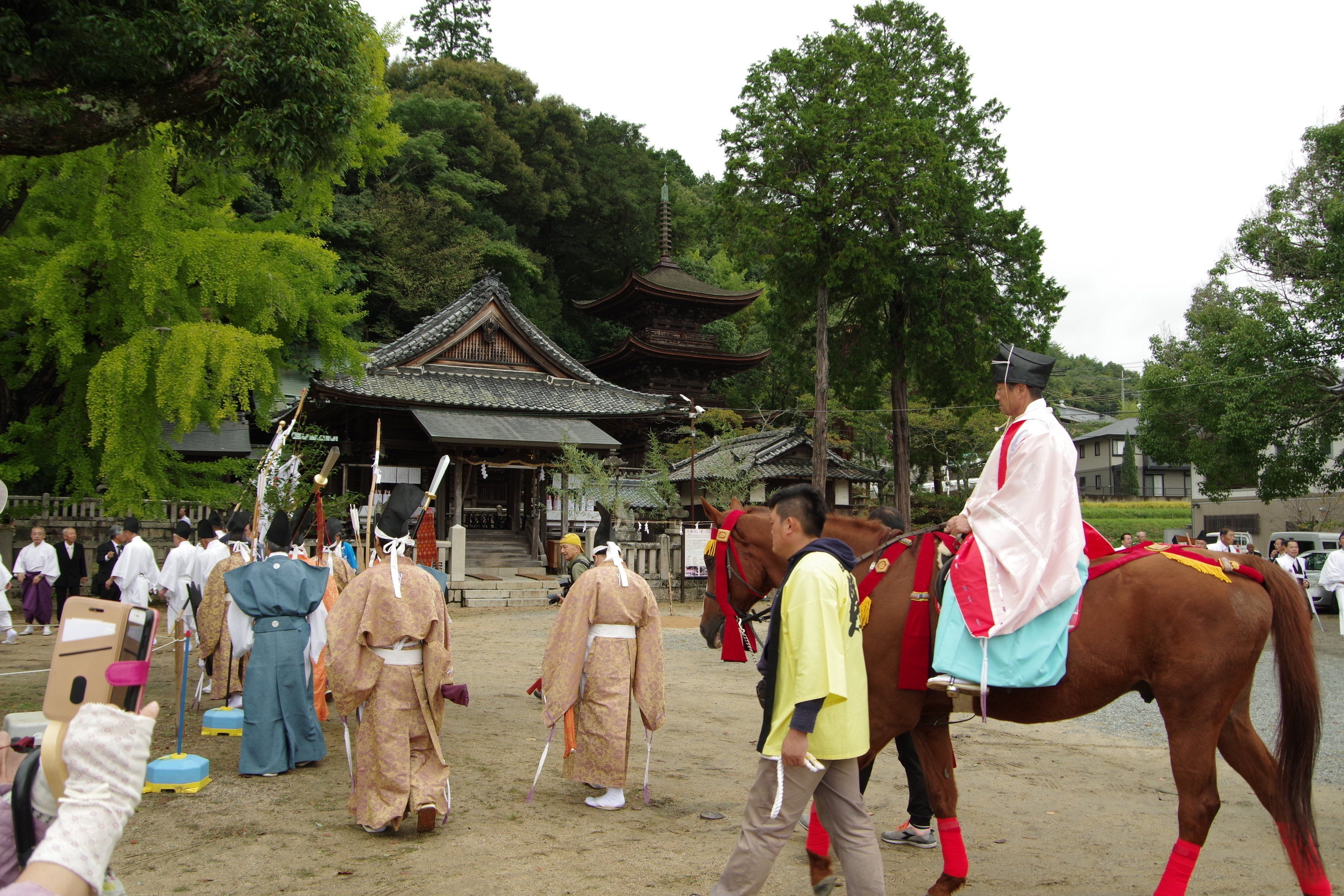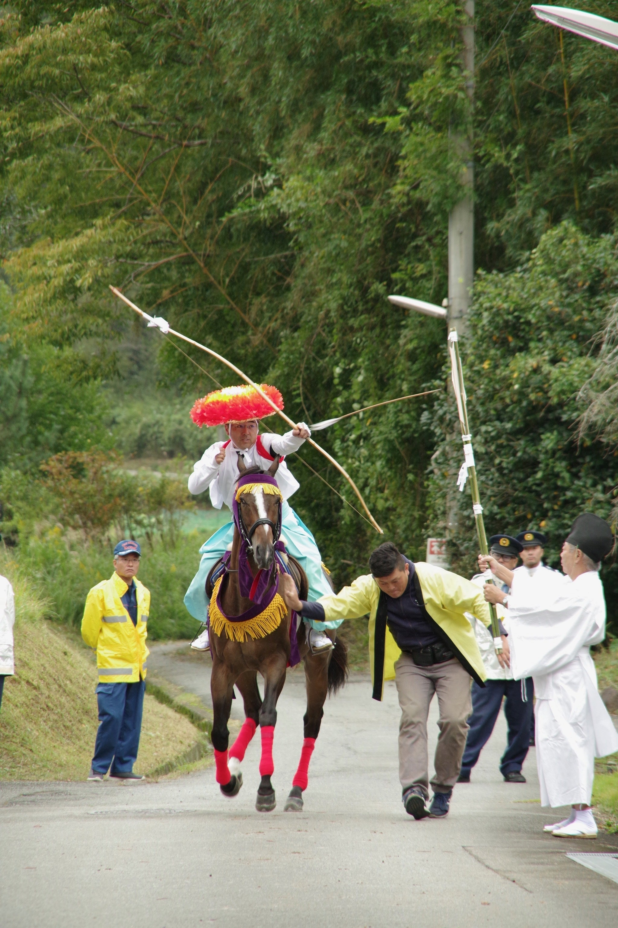 当日はまず山田町最古と言われる東下大歳神社に参拝し、七社神社で流鏑馬を行います。七社神社では神社から外に向かって流鏑馬を行います(「駆け出し」といいます)。その後六條八幡宮で神社に向かって流鏑馬を行います(「駆け入り」)。