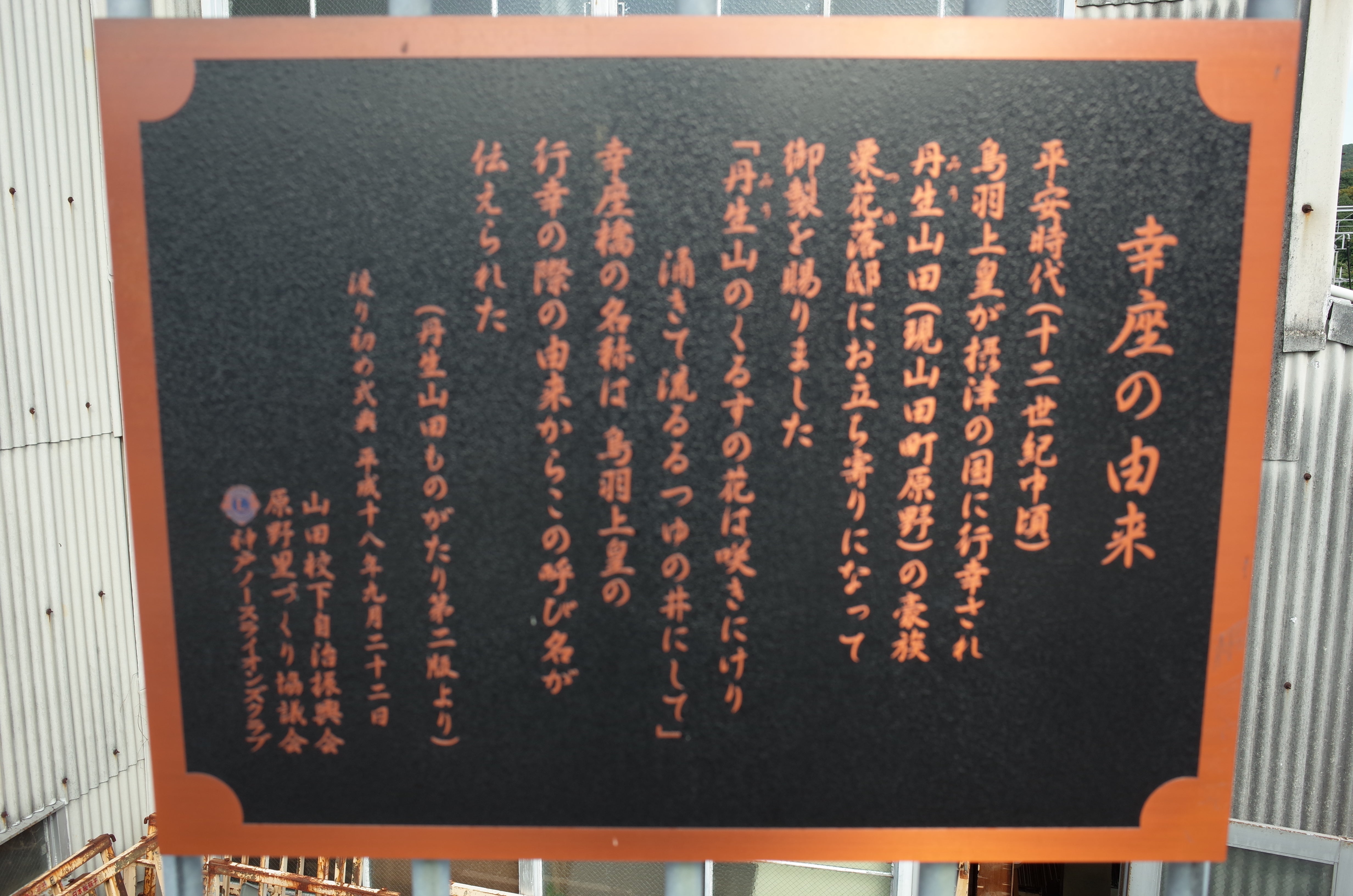 さて、山田川(志染川)に「幸座橋」という橋が架かっています。「幸せ」が「座る」橋•••?平安時代中期に鳥羽上皇が摂津国に行幸されたときのこと、丹生山田の里の豪族、栗花落(つゆり)邸を訪れ御製を賜りました。