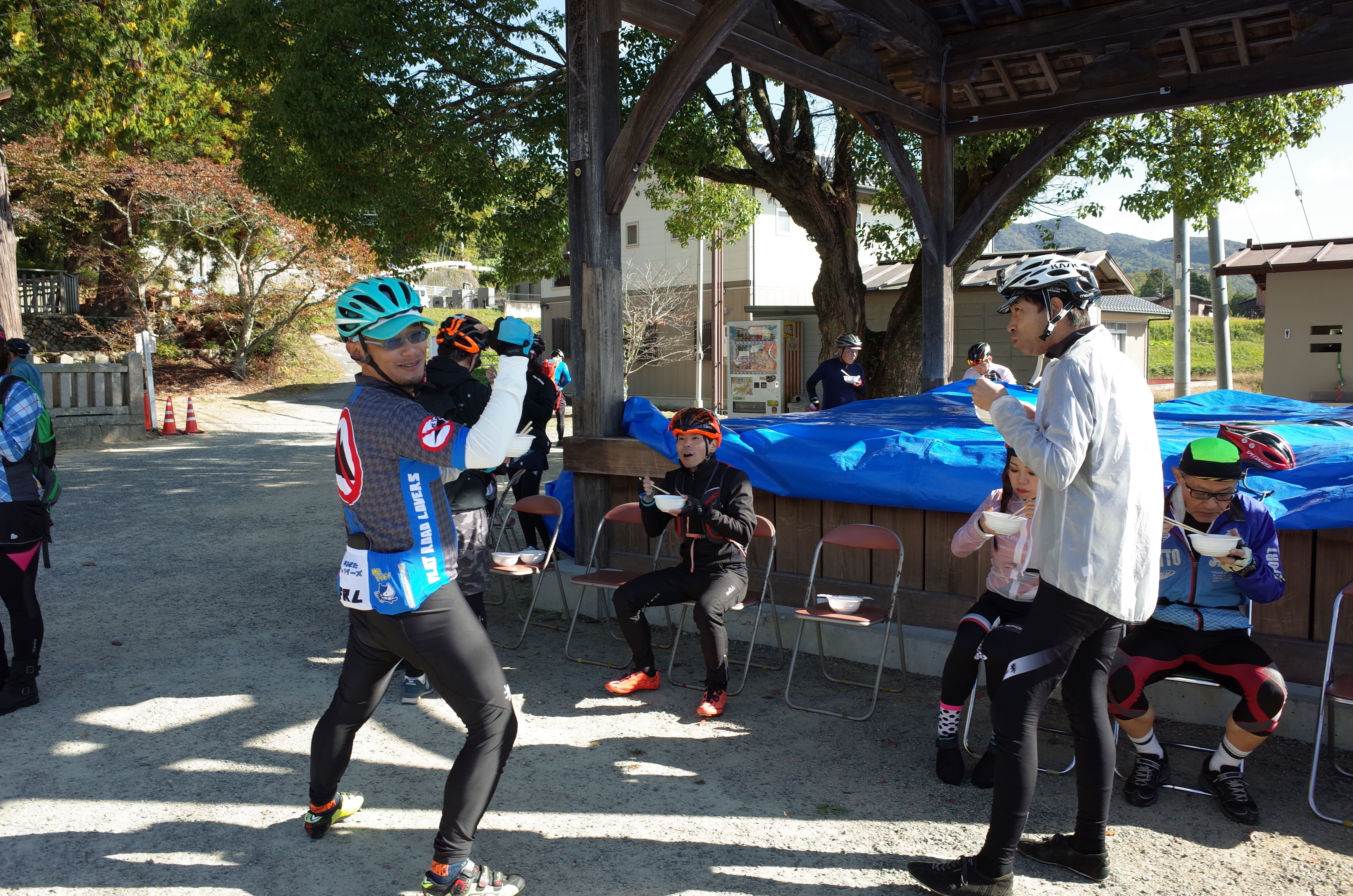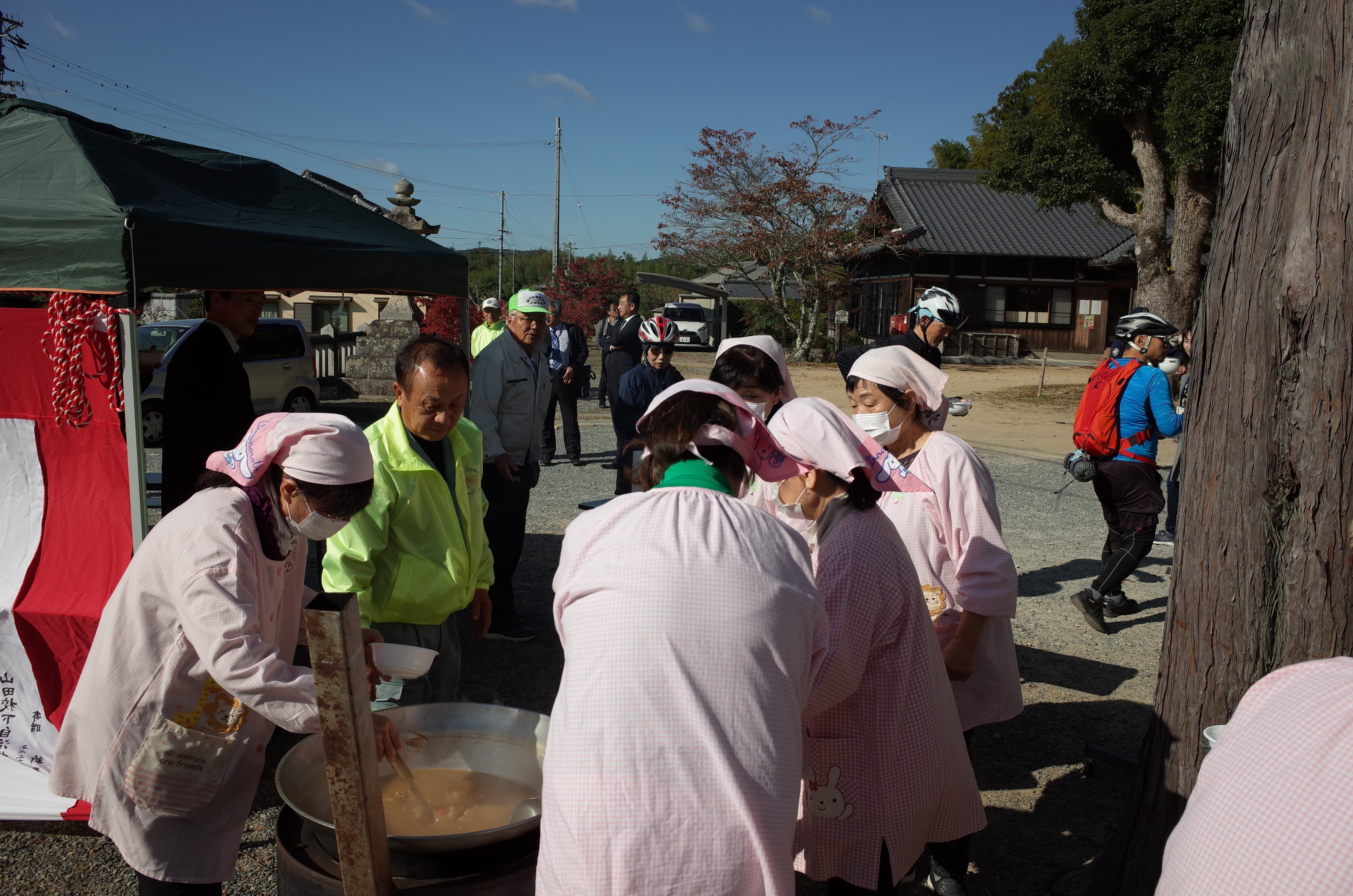 リニューアルイベントの一環として、六條八幡宮の境内で地域住民による炊き出しが振舞われました。メニューは豚汁です!本日は神戸電鉄に自転車をそのまま持ち込める特別列車が運行されており、箕谷駅からオープン式典に向かう参加者約80名が来場されました。