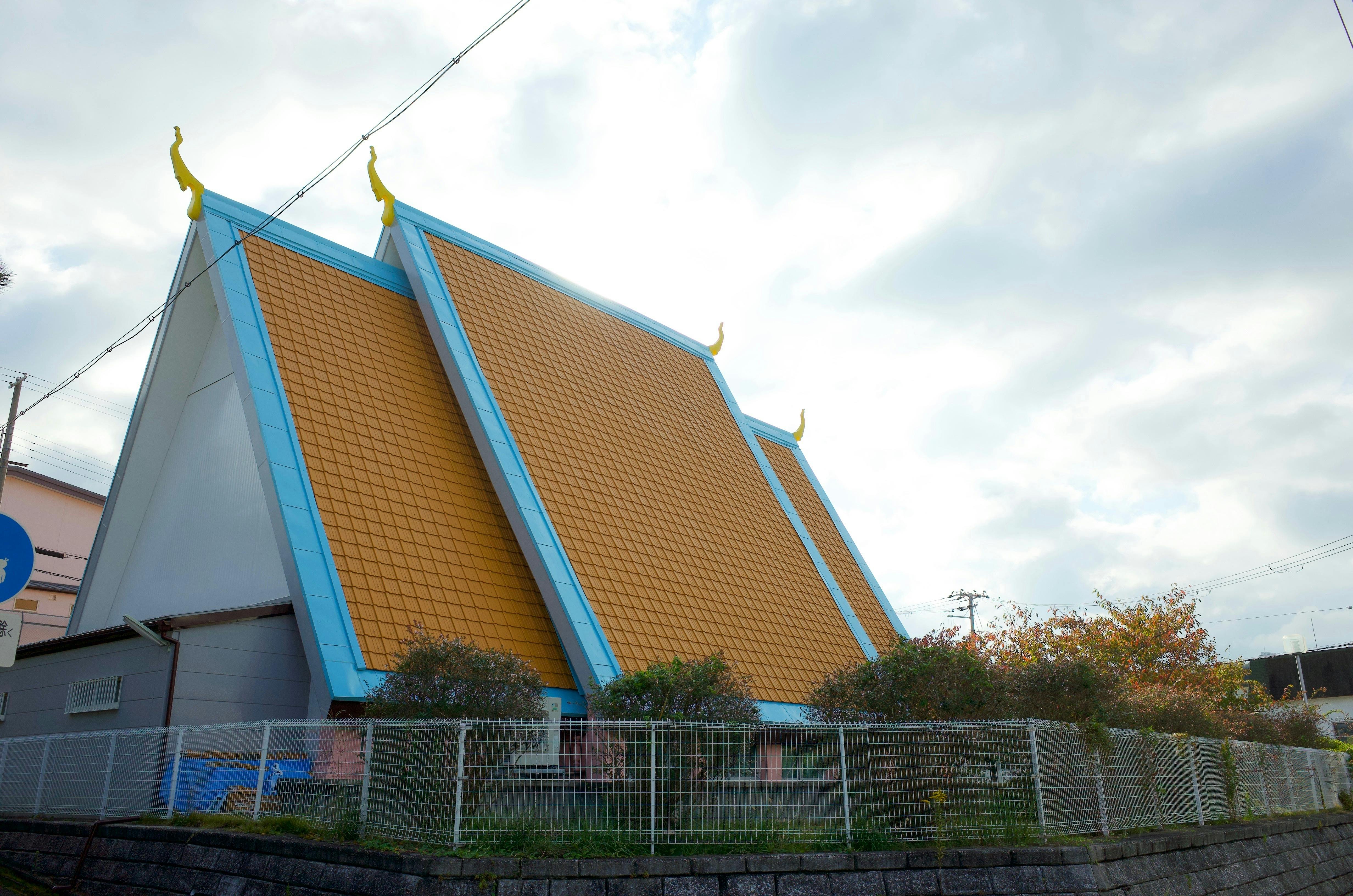 鮮やかな色彩と急勾配の屋根。新クメール建築という貴重な建築様式だそうです。敷地内には仏像のレプリカや大阪万博の展示物も多数保存されており、新しい史跡と言えるのではないでしょうか。