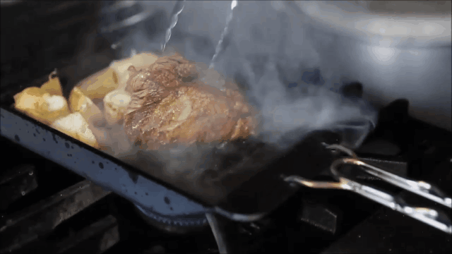 Fe5.0の高い蓄熱性を利用して、2)では高温を保つことができ、さらに鉄の厚みにより直火が当たっているところだけが熱くなるような加熱ムラを抑えるので、しっかりとした「焼き色=旨み」を付けることができます。「しっかり予熱」と「高い蓄熱性」で、お肉表面を一気に焼き固めることで水分の流出(旨味の流出)も少なく、お肉そのものの旨味と香ばしい美味しさを同時に味わうことができます。
