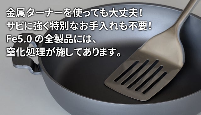 Fe5.0はこの厚みゆえ熱による変形が起きにくく落としても割れたりしません。通常の鉄フライパンと同じメンテナンスで「一生モノ」の料理道具となります!
