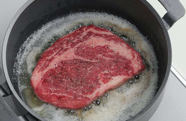 牛リブロース肉の両面に塩、胡椒をまぶす。