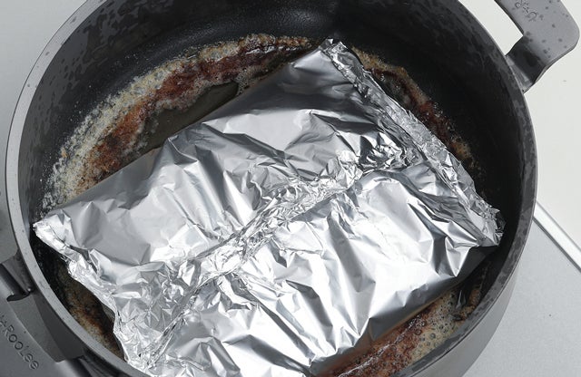 両面に焼き色が付いたら肉を取り出しアルミホイルで2重に軽くふわっと包む。Fe5.0 に戻し火を止めたまま蓋をし20 分ほど余熱で火を通す。