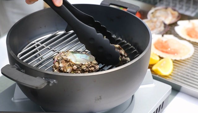 魚介の旨味を短時間で煮出したイタリアのトラットリアで食べられる料理です。短時間煮込んだら、あとは火を切って、Fe5.0の「高い蓄熱性による余熱」を使って優しく火を通すことで、魚介が固くならずに仕上がります。水分少なめで煮込むので魚介の出汁をしっかり味わえ、食べ終わったスープにご飯を入れてリゾットにしても美味しいです。