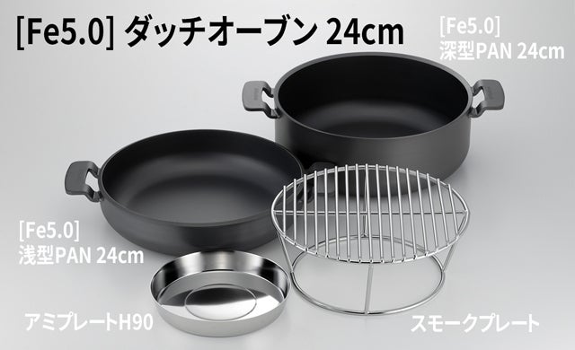 蓋無しの浅型PAN24cmと深型PAN24cm、高さ42mmのアミプレート、スモークプレートのセットです。燻製や蒸し料理にも。浅型PAN24cmと深型PAN24cmはお互いを蓋としても利用できます。ご飯を炊いたり、ダッチオーブンのような使い方も可能です。