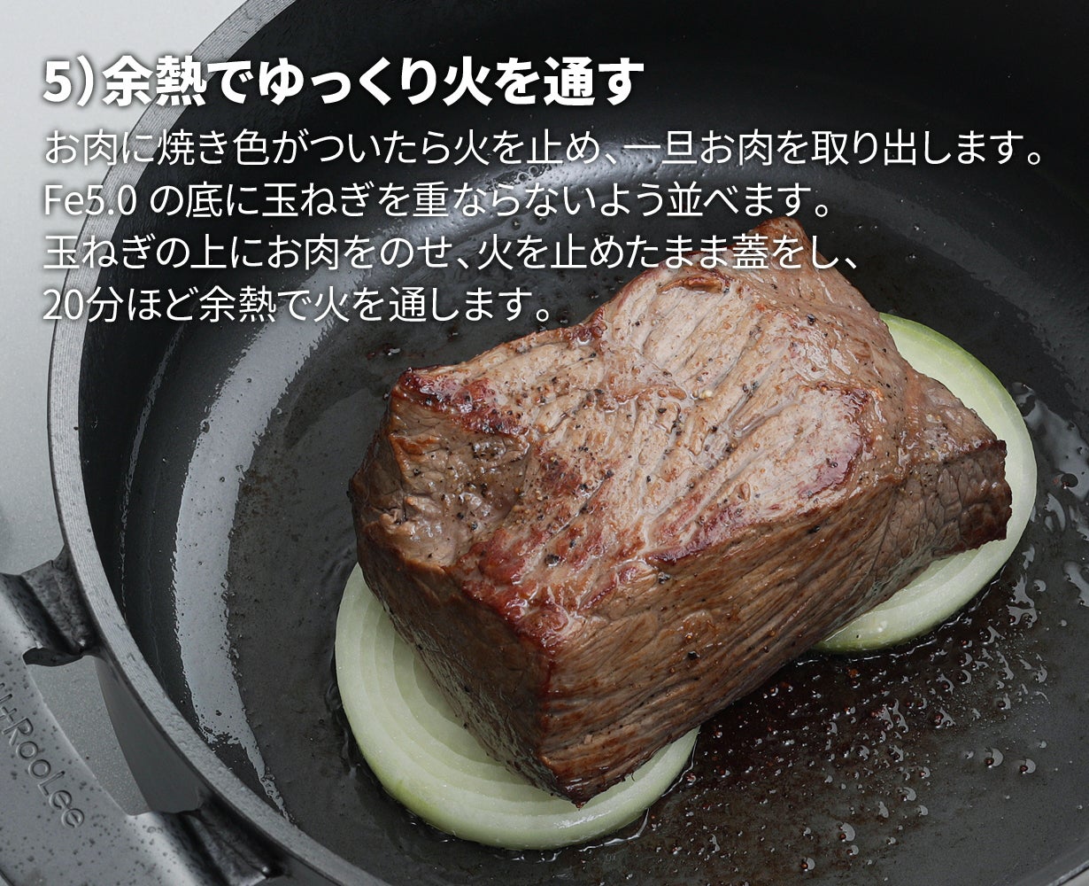 通常、お肉は冷蔵庫から取り出して常温に戻しますが、このレシピではお肉を冷蔵庫から取り出してすぐの冷えた状態で調理を始めます。理由は、お肉の状態が同じならば、季節などに左右されずにレシピの再現性が高くなるからです。冷えた状態から調理を始められるのもFe5.0の高い蓄熱性を利用しています。