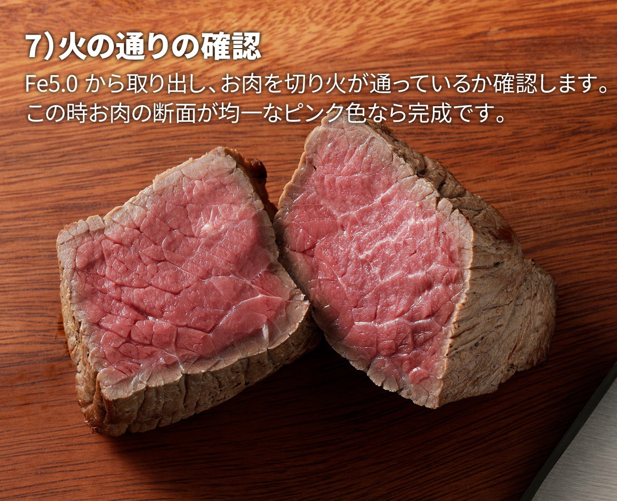 Fe5.0 から取り出し、お肉を切り火が通っているか確認します。この時お肉の断面が均一なピンク色なら完成です。