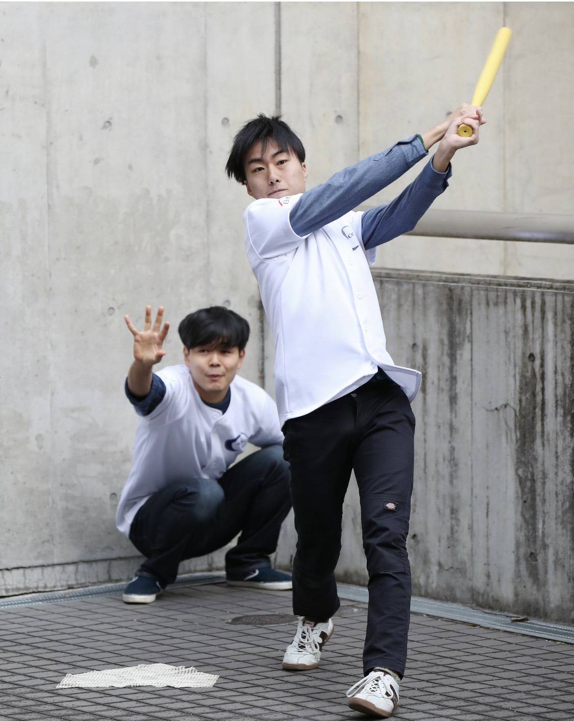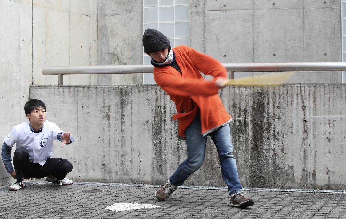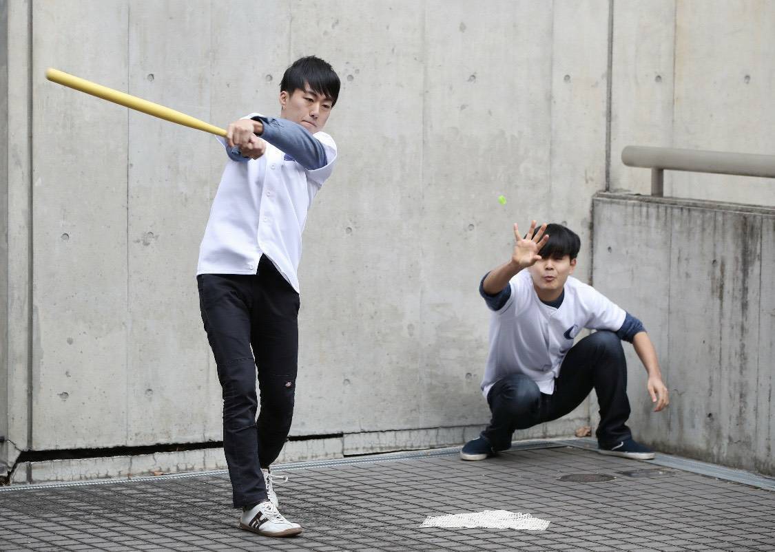 キャップ投げはその名の通り、ペットボトルのキャップを投げることですが、我々はこの投げられたキャップをプラスチック製のバットで打つスポーツとして、ルールを作り上げ、競技として確立しました。我々はこのキャップ投げを日々鍛錬しています。ちなみに普段の練習風景は、こんな感じです。