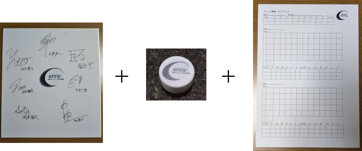 2. キャップ投げで使用するキャップ投げ用品(オリジナルキャップ3個とオリジナルスコアシート10枚のセット)のセットをお渡しします。1のサインを執筆するメンバーは京都大学キャップ投げ倶楽部で選定します。送料は支援者にご負担をお願い致します。着払いで送付します。