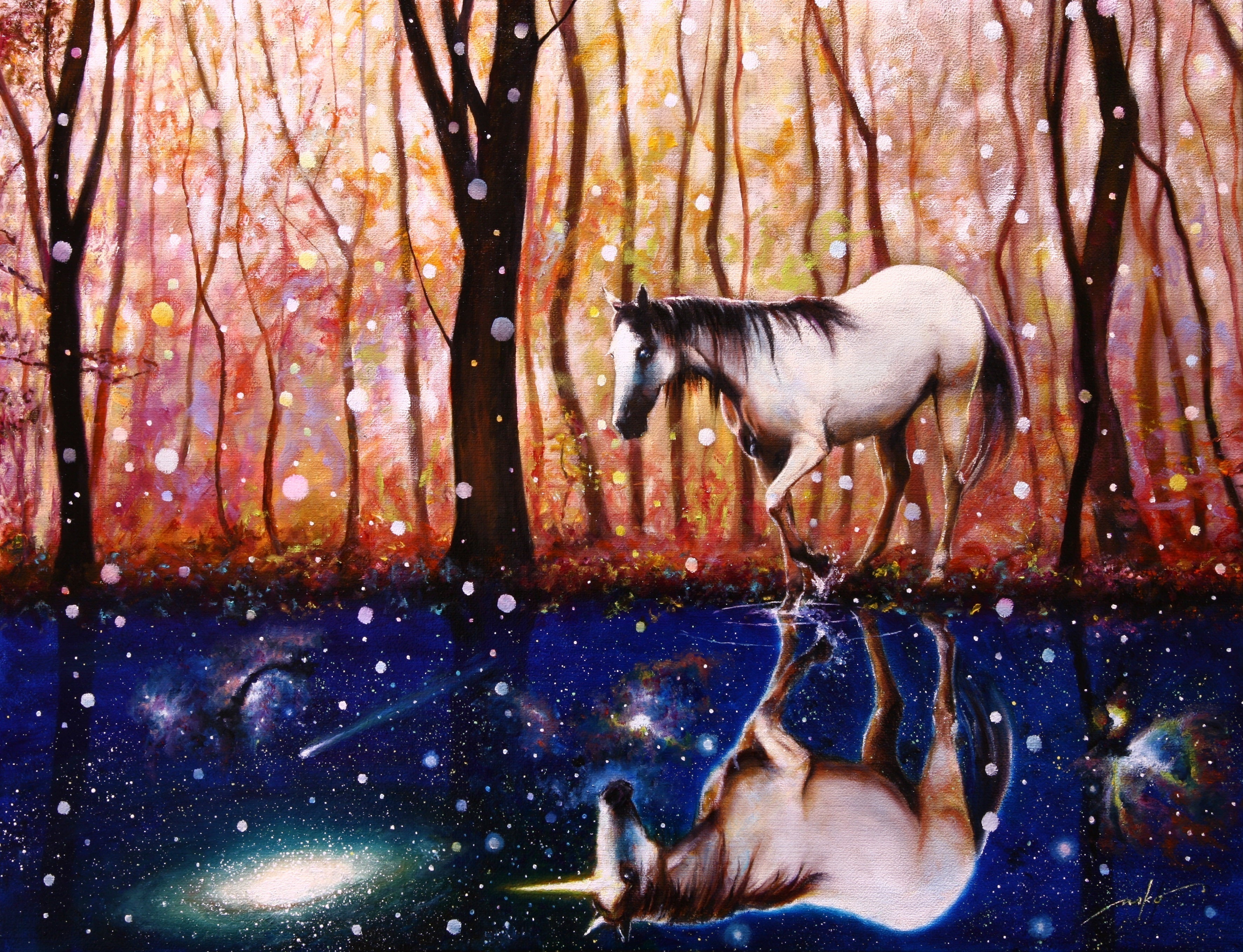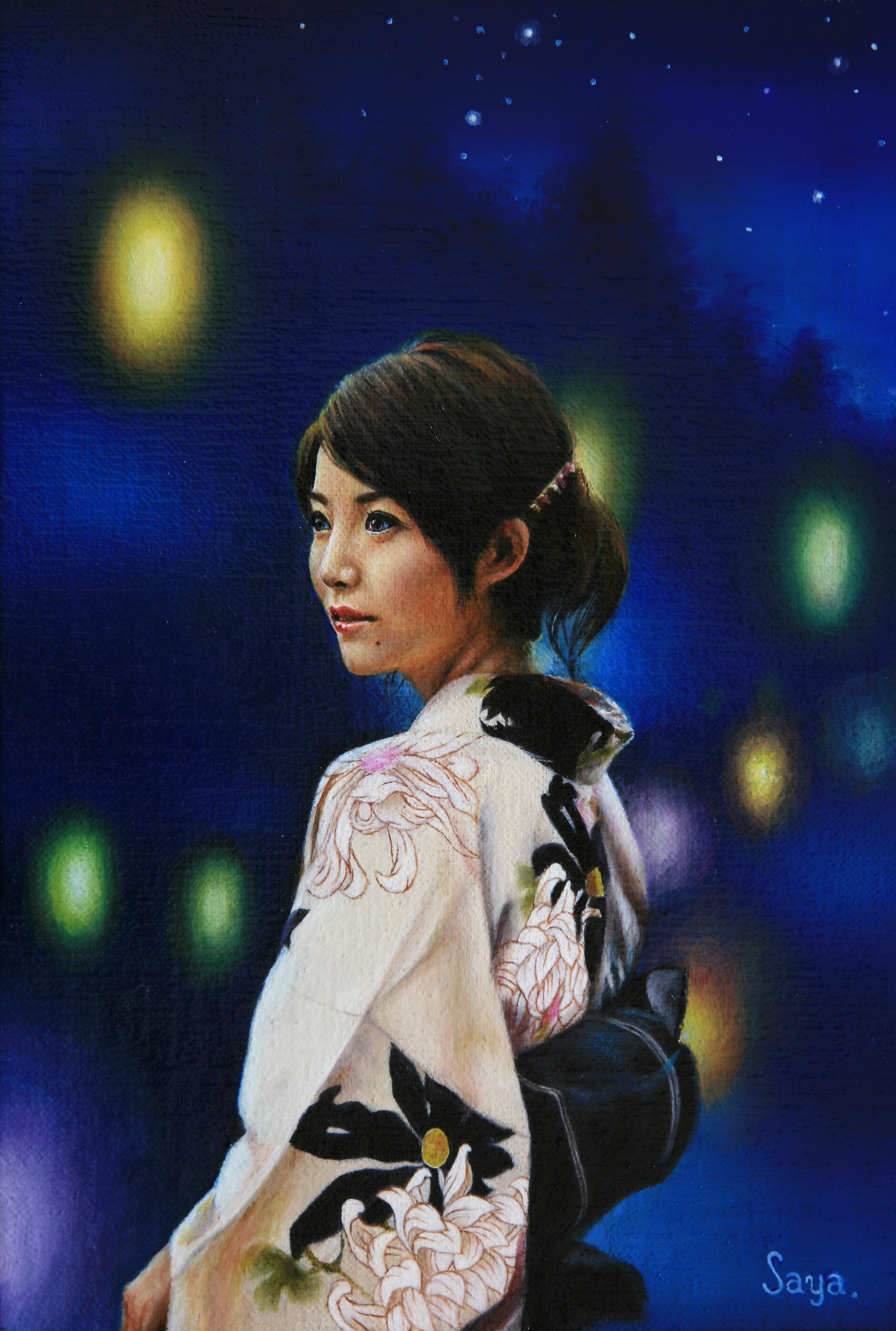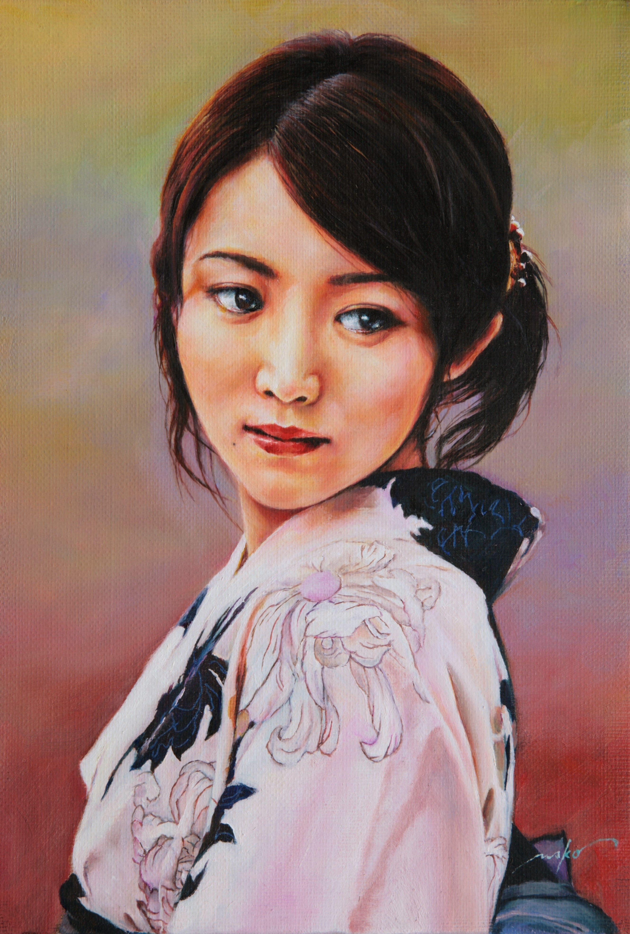 愛弟子である田代紗絢香は猫と宇宙をこよなく愛する画家であり、優しく美しい心をもった女性です。本文上部の浴衣の女性の作品【絢爛】(大根田真作)のモデルでもあり、下部の作品【風光る】【祭りの灯】はともに彼女の自画像です。