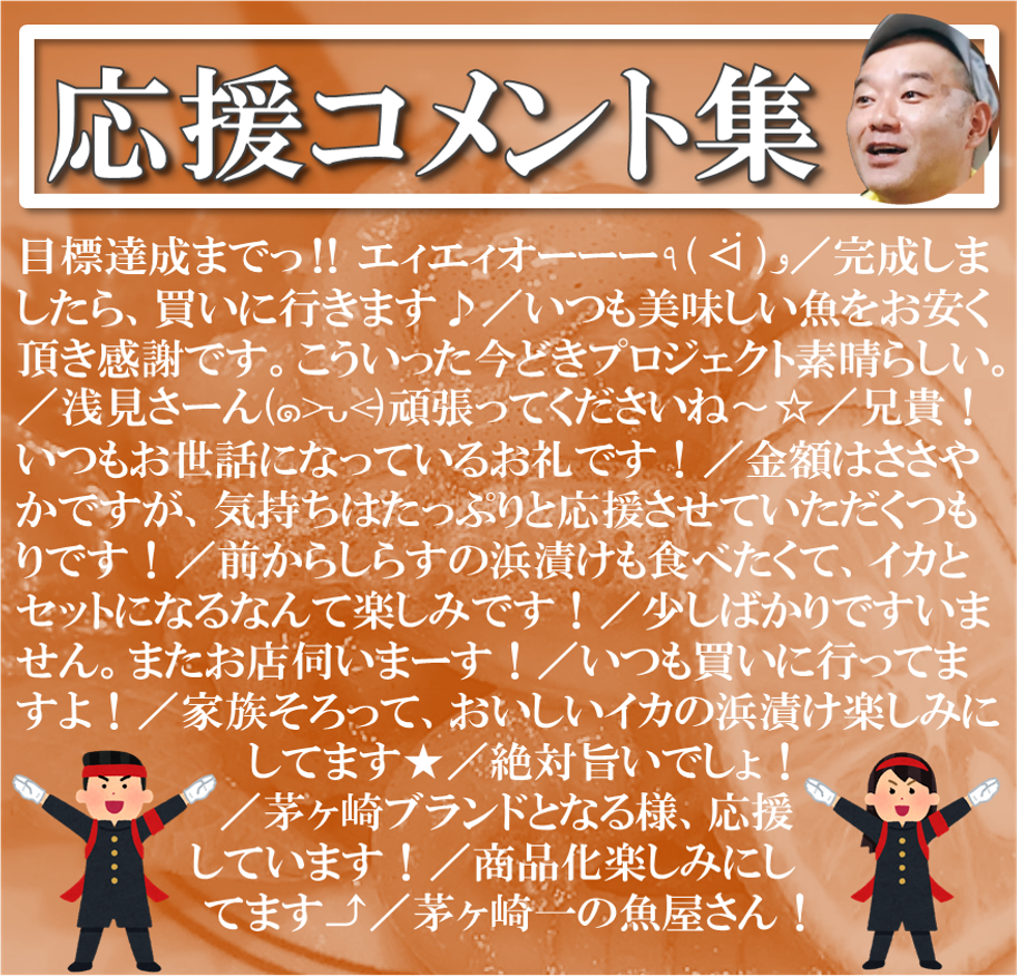 魚卓の浅見です!クラウドファンディング挑戦、15日目です!この度、なんと…Gyoppy!(※)に魚卓の記事が載りましたー!!→「スーパーにはない魚が買える」茅ヶ崎の人気鮮魚店が果たしている大事な役割魚卓が地魚を扱う理由についてしっかり書いてあるので、お時間あるときにぜひ読んでみてくださいね!※Gyoppy!(ギョッピー)は海の豊かさを守るためにつくられたメディアです。他にも面白い記事がたくさんあるのでぜひチェックしてみてくださいね!さて、そんな地物にこだわる魚卓が商品化を進めている「相模湾産イカの浜漬け」のCAMPFIRE進捗ですが、「50人・30万円」の大台を超えることができました!ありがとうございます!!CAMPFIREを始める前はここまでご支援いただく方が多いとは思っていなかったので、本当に本当に感謝しかありません。あらためて皆様に支えられていることを実感しております。とはいえ!まだネクストゴールの40万円まで到達していないので、引き続き頑張ってまいります!シェア・ご支援をよろしくお願いします!→茅ヶ崎・魚卓の「イカの浜漬け」を商品化して、みんなに食べて欲しい!※12月に寿司パーティを計画しませんか?魚卓特選寿司リターンの受け取りカレンダーはこちら!