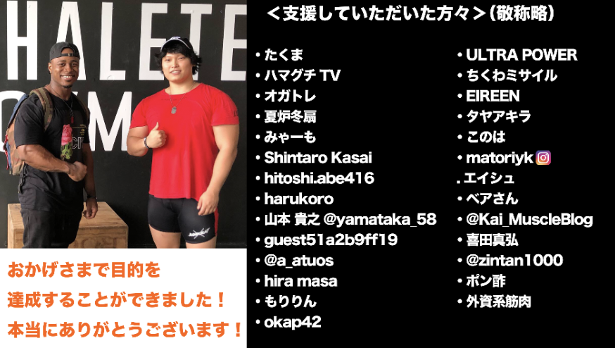 その他、アメリカにパワーリフティング遠征にかかる費用や、アメリカでしか買えないサプリのレビュー動画も撮影していく予定です。