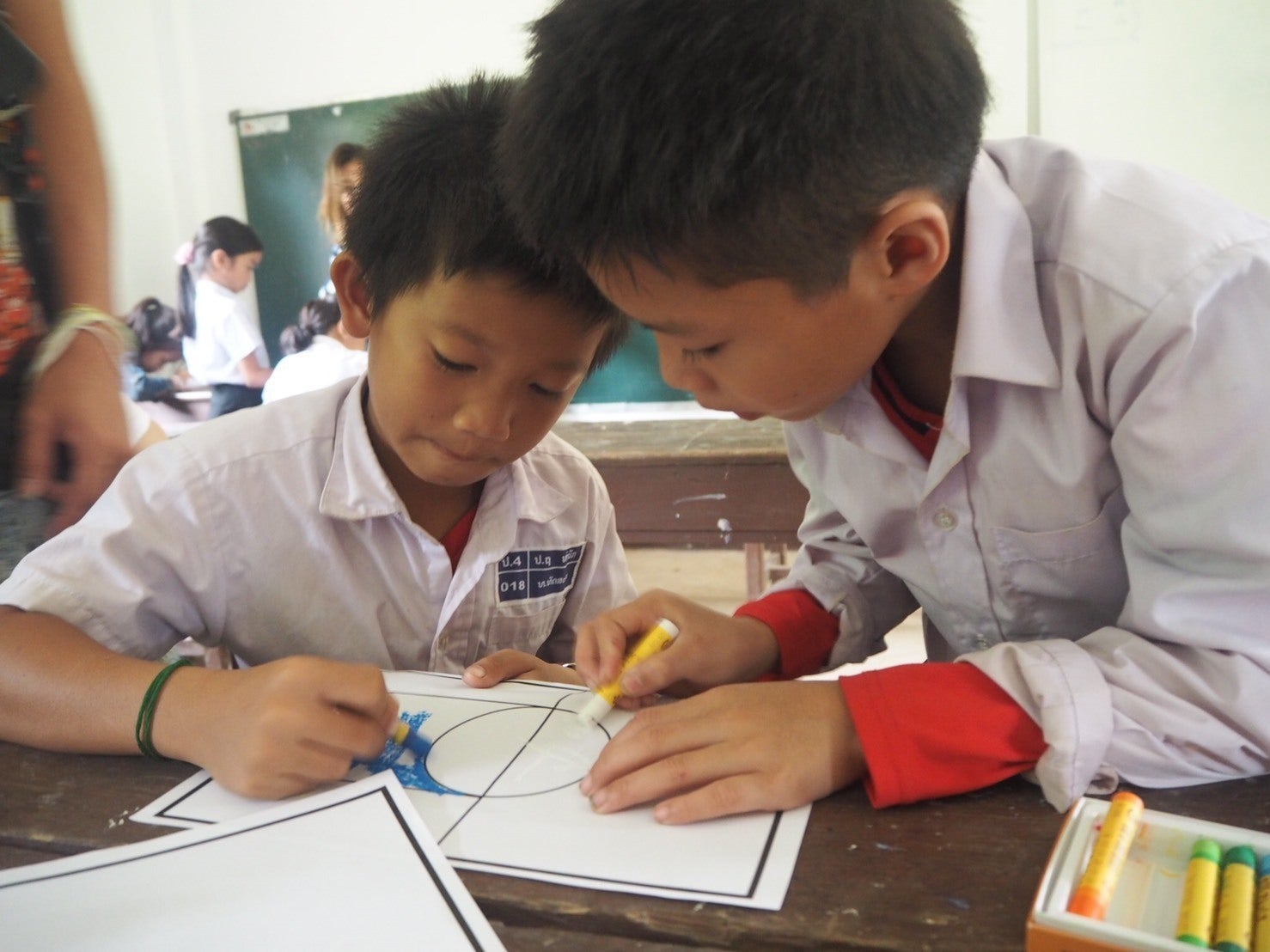 →日本とラオスの国旗を描いている様子。