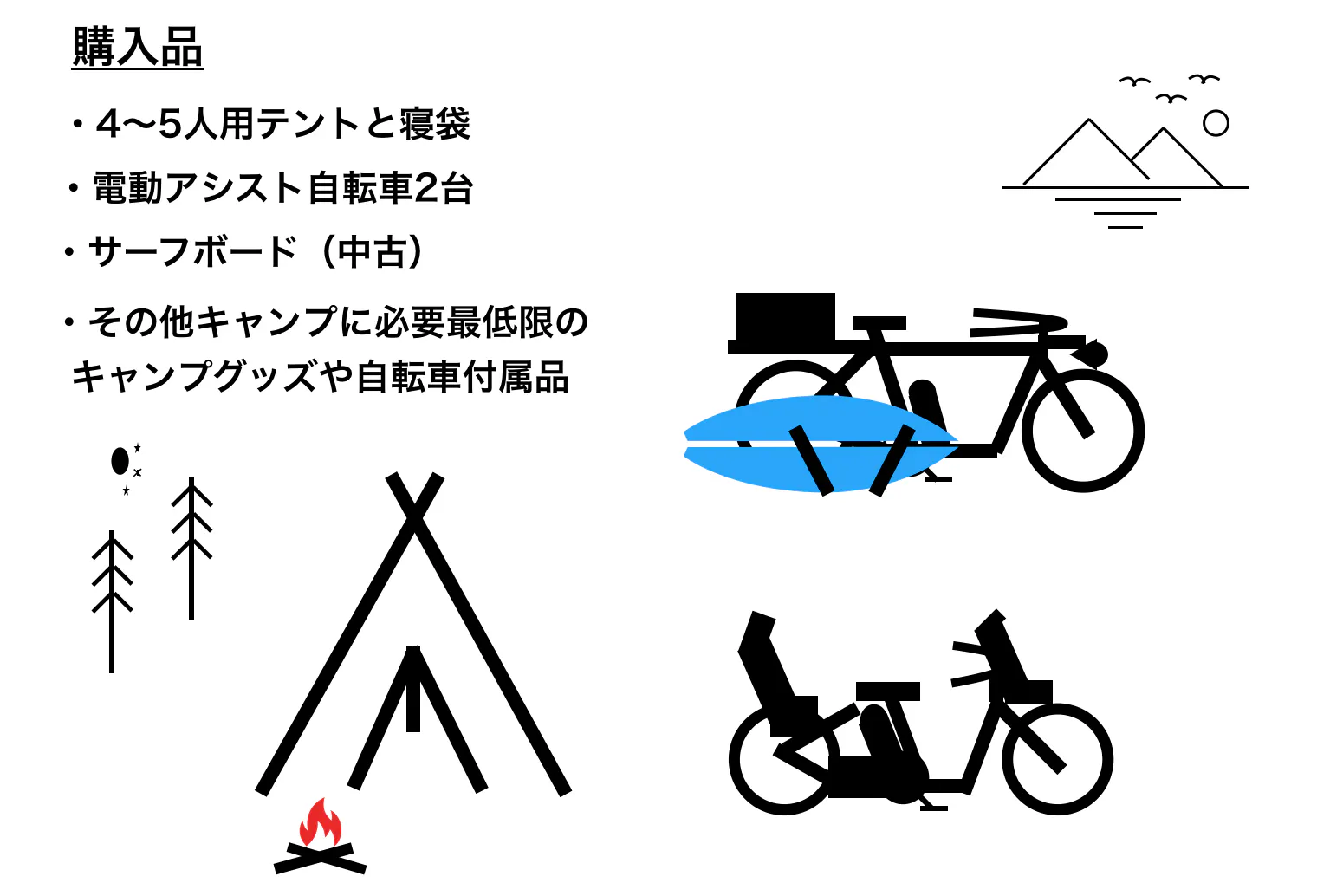 用意させて頂くものはテントと寝袋と自転車のみ。