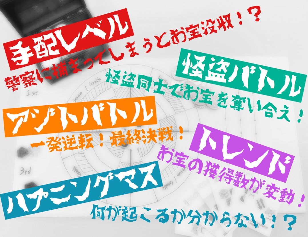 人々が寝静まった夜の街を舞台に、プレイヤーは怪盗となり、他の怪盗より多くお宝を集め互いに奪い合うゲームです🎩