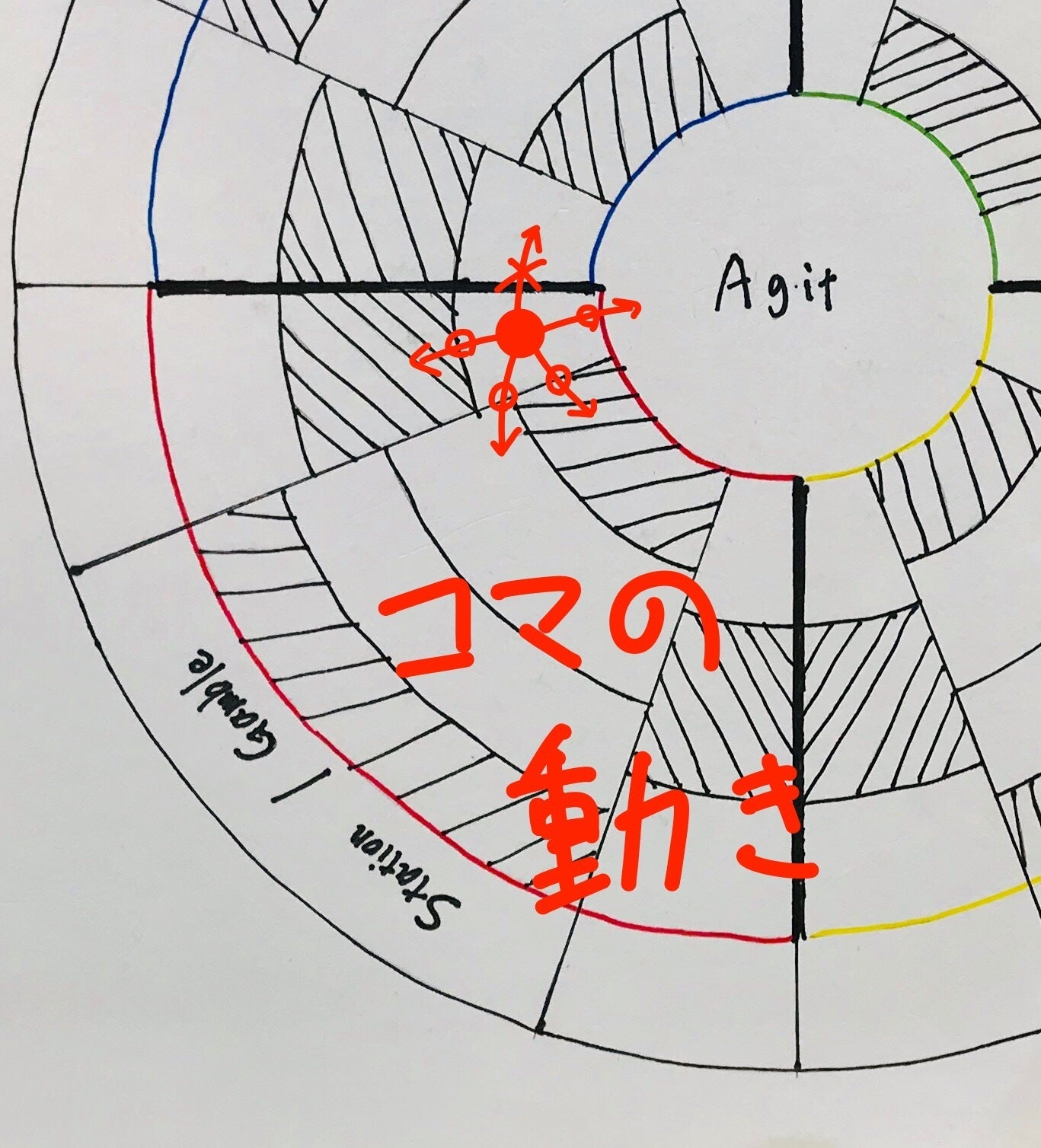ゲームを始める時、コマは必ずボードの中心にあるアジトマスから自分のコマと同じ色の陣地へ向けてスタートします。順番にサイコロを振り、出た目の数だけコマを動かします。この時、コマは隣接するマスであればどの方向にでも動かすことができます。※ただし、太線を超えて移動することは出来ません。