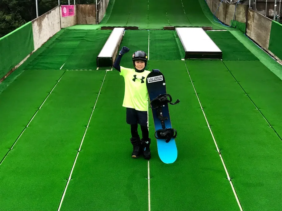 (シーズンオフも人工芝のスキー場にて練習に励む、デフキッズ)