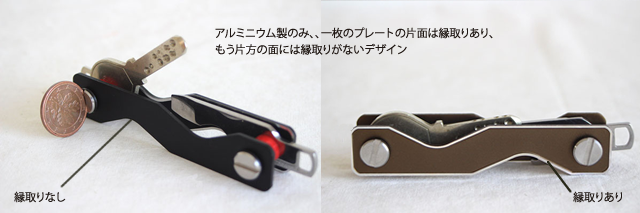 アルミニウムタイプのみ、プレートがリバーシブルになっています。アルミプレートの片面はシルバーの縁取りがあるデザイン、もう片面は縁取りのないデザインになっていて、1つで2パターンのデザインをお愉しみいただけます(※スマートフォンスタンドとしてお使いいただく場合は、キーホルダー本体の表裏のデザインが異なるようにセットされます)。