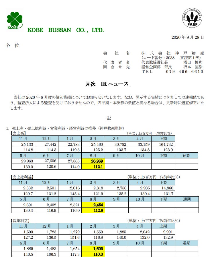 (2020年9月28日 神戸物産 月次IRニュースより)
