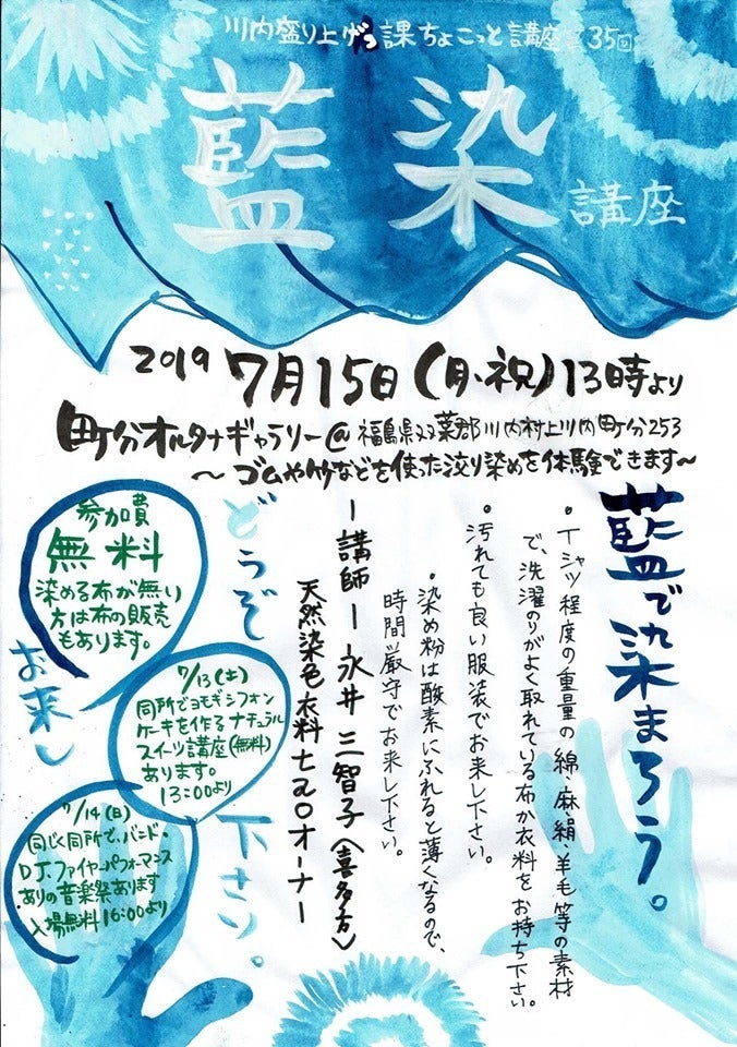・藍染め体験ワーク(自分で染めたい衣料等をお持ちいただき、絞り染めを体験します。講師に喜多方在住の自然染料作家さんが来てくれます。時期5月~10月)