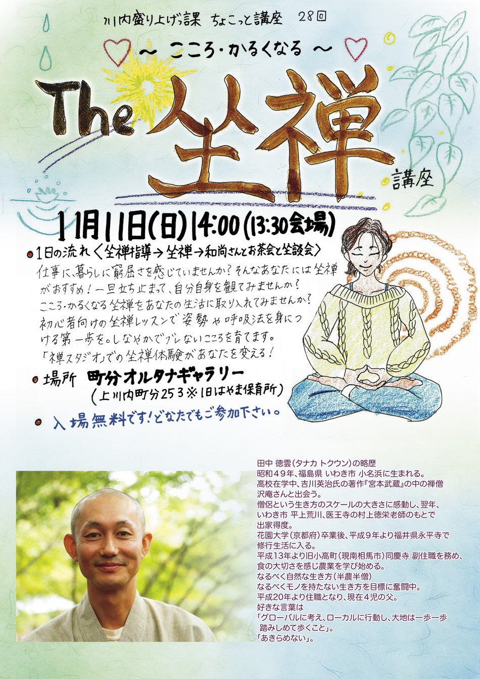 南相馬にある同慶寺の住職、田中 徳雲さんに講師をしていただきました。初めて体験される方が多く参加されました。