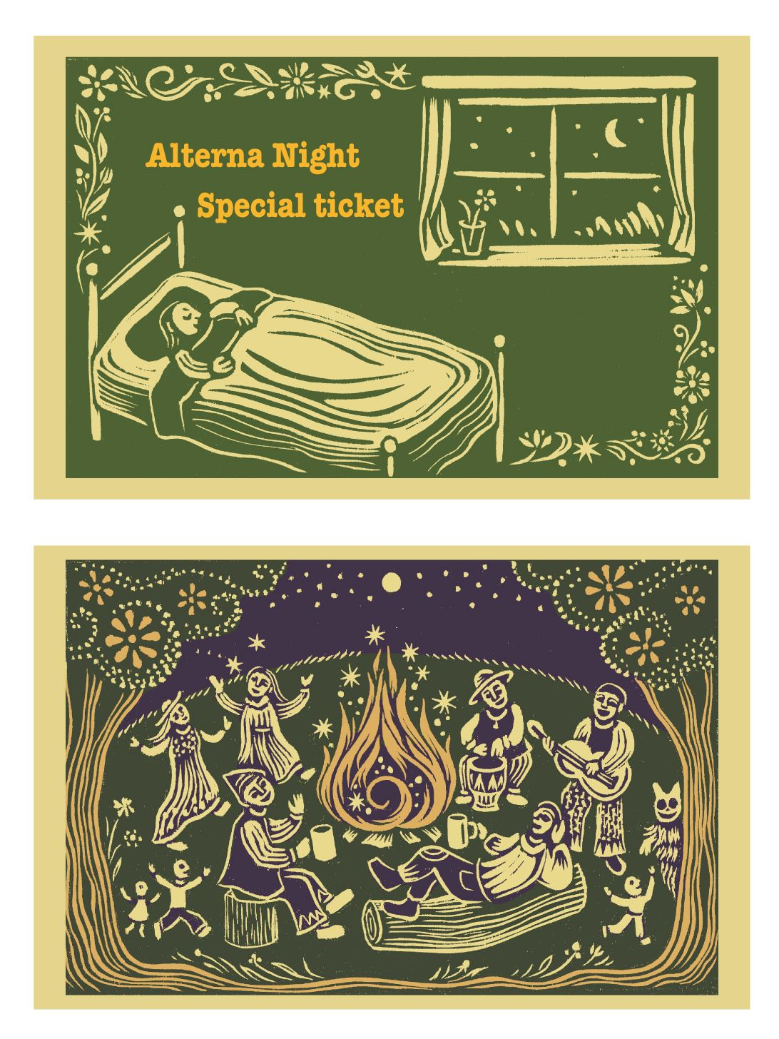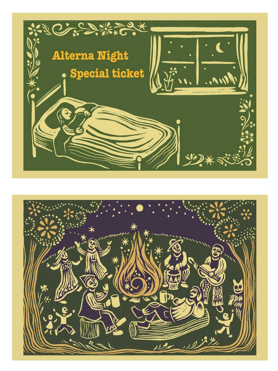 民泊利用券は、木版画家の大久保草子さんが、今回特別に彫って頂いた、木版画が印刷された利用券をお送りいたします。交通費などは実費となります。素泊まりとなります。