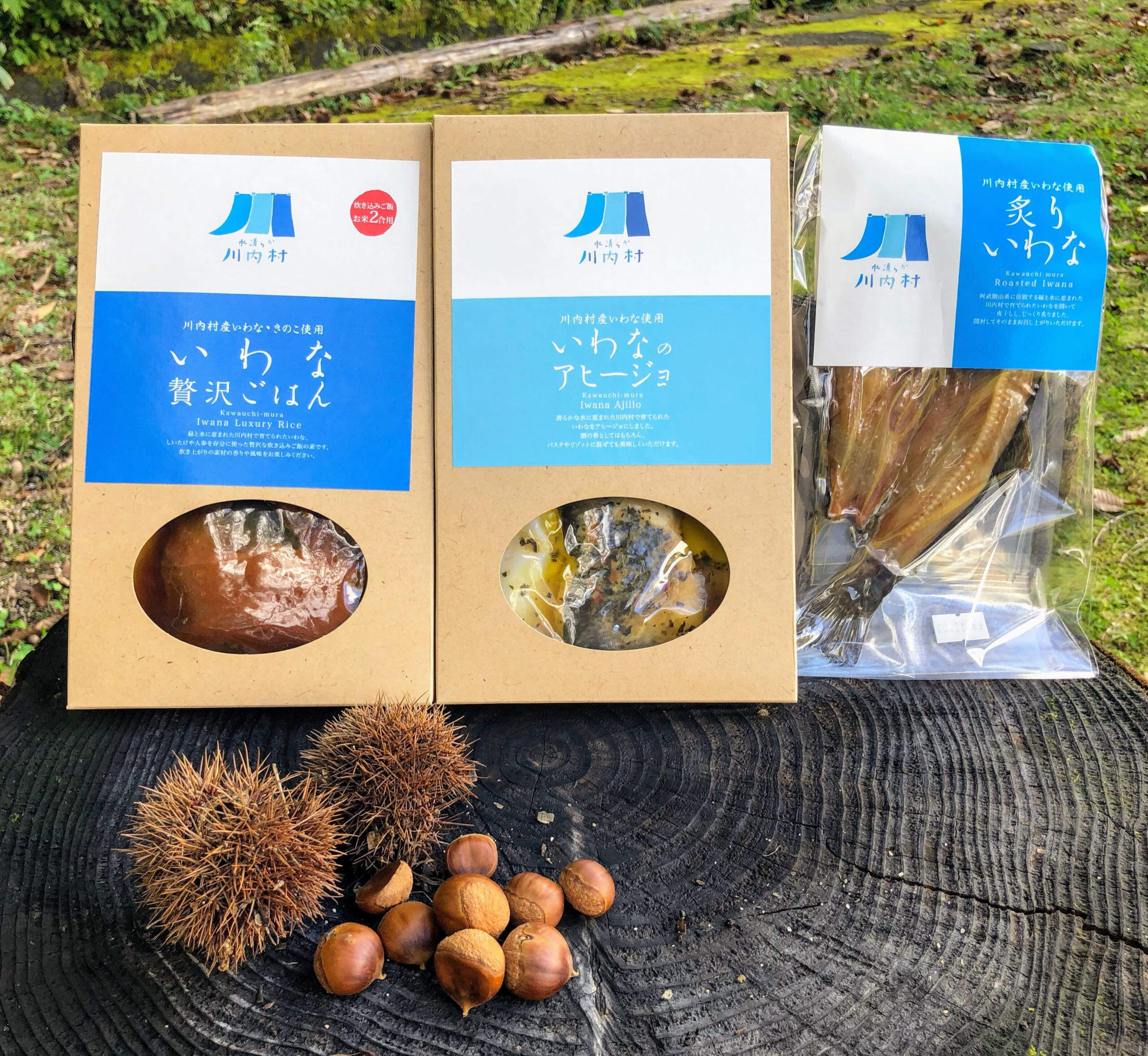 いわなの贅沢ご飯、イワナのアヒージョ、炙りいわな、の詰め合わせセット。