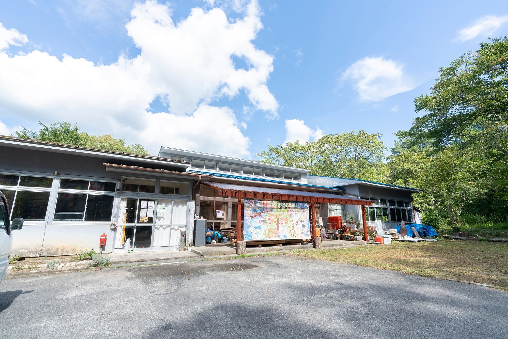 町分オルタナギャラリー外観 「町分オルタナギャラリー」の施設は築年数50年以上経っていますが、かつては村の保育所として使われていました。村長や、商工会会長をはじめ、多くの村の方々が幼少期を過ごした、思い出深い場所です。私たちは、そのような村の人たちの思い出が詰まった施設を、もう一度沢山の人が交流できる場所になるように、みんなで手を加えて修復してきました。