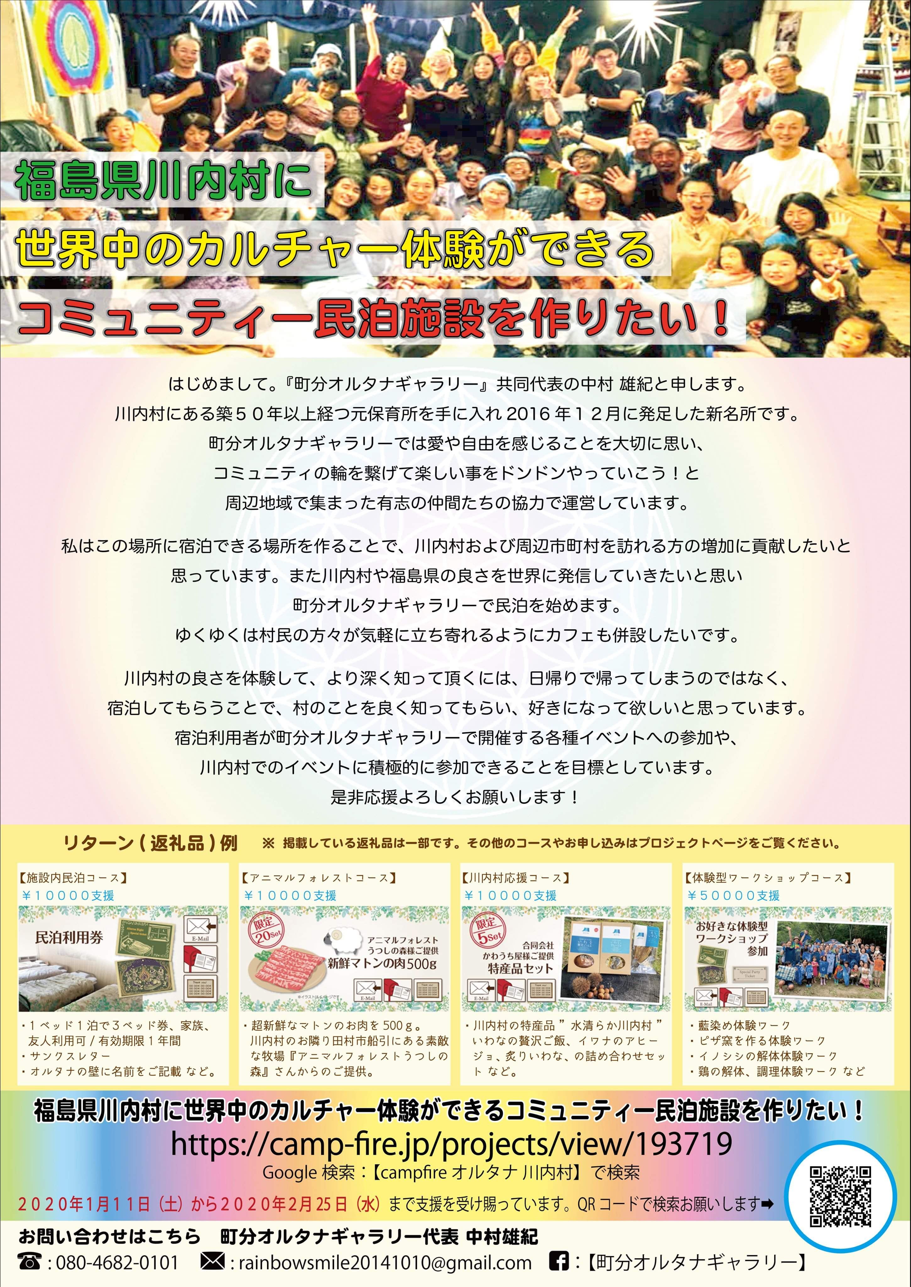 オルタナチラシ美人と撮ろうの旅川内村にある、商業施設YOーTASHIに勤めていらっしゃる渡邊絵里さん!川内村の広告塔として各地で活躍してらっしゃいますゆうきくんが、おてんとSUN企業組合の島村さんと共に、ネパールへ太陽光パネルを設置に行った時、ネパールへ旅行中の絵里さんとバッタリ遭遇!なんてこともありました福島と旅を愛するアクティブ女子勤めてらっしゃる、YO-TASHI内のけろりん堂さんでは、地元のお年寄りのニーズに応え、必要な日用品を扱っています。川内村の酒米「夢の香」を使った吟醸酒、「歸宴(かえるのうたげ)」や、川内村の蕎麦を使用した蕎麦ビールも扱っています!歸宴は、新酒お披露目回が2月15日、川内村のコミュニティセンターであるそうです!新酒を楽しんだ次の日は、町分オルタナギャラリーでバングラデシュカレーパーティー↓↓↓↓↓↓↓↓https://www.facebook.com/events/801965466938793/?ti=ia定食(かわうちの湯、幻魚亭)、十割蕎麦(蕎麦酒房天山)、タイ料理(café Amazon)、ラーメン(らーめんみなみ、つばさ屋、川泰分店)、カレー(毎月第1日曜日に幻魚亭にて)、お酒(蕎麦酒房天山、居酒屋天華、スナック美穂、カラオケ演歌)ときどき蕎麦ガレット甘い物は手作り柏餅、味噌饅頭、天山さんの蕎麦豆腐などなどそして美味しい空気美味しい川内村をぜひ堪能しに来てください↓↓↓↓↓↓↓↓↓↓↓↓↓福島県 川内村に、世界中のカルチャーが体験できる体験型民泊施設を作りたい!!川内村 町分オルタナギャラリーはクラウドファンディングに挑戦中ですhttps://camp-fire.jp/projects/view/193719