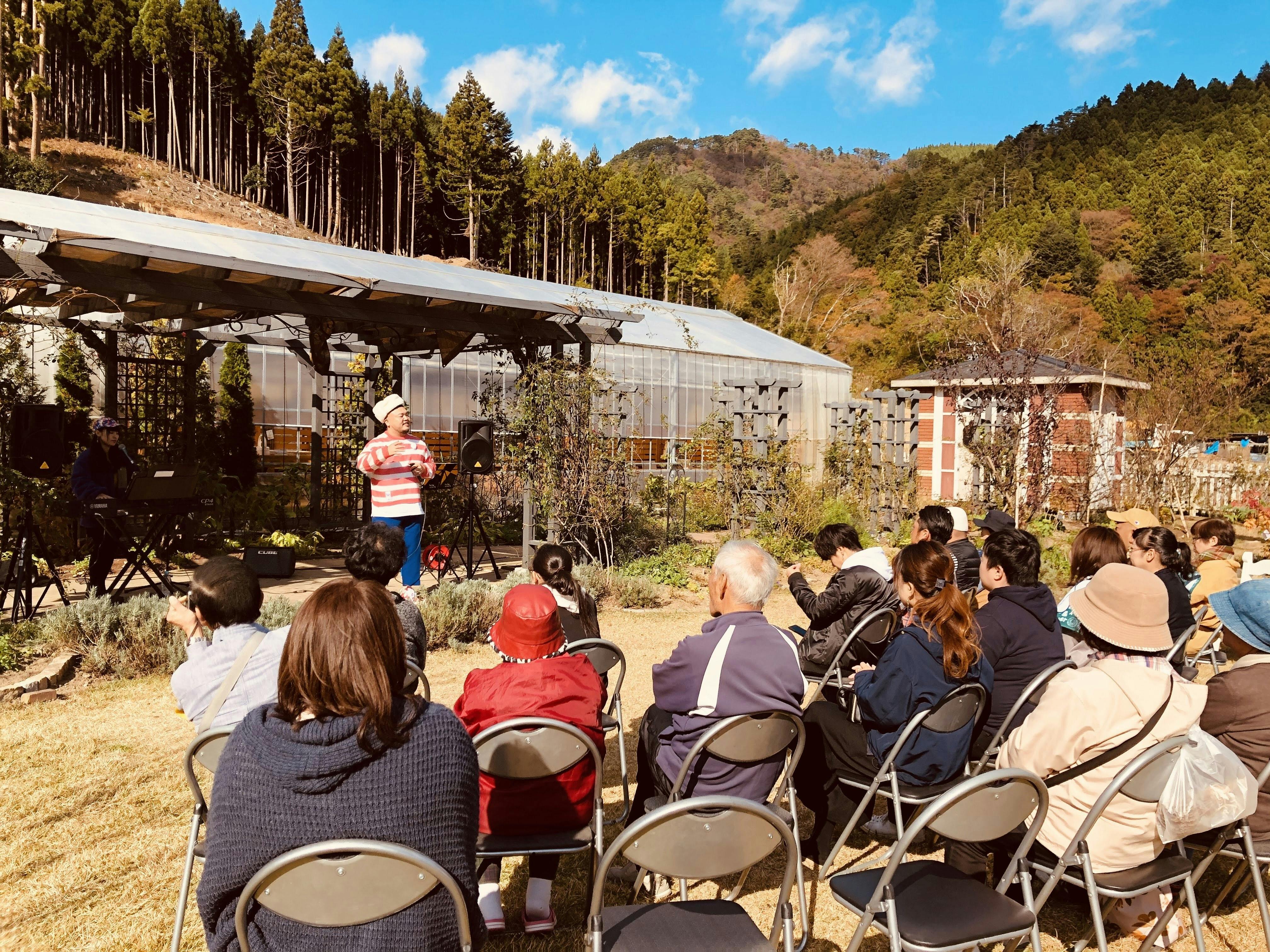 ライブには若い方からおじいちゃんおばあちゃんまで約40人の方がご来場いただき、開放的な自然の中でのライブを楽しんで頂きました。