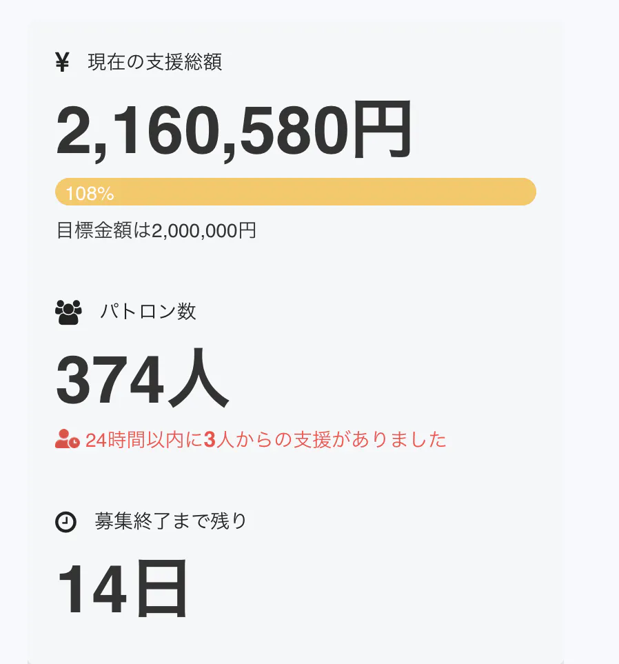 それでも新規・追加のご支援は未だに続いており、現時点で216万円以上のご支援を頂くことが出来ました。