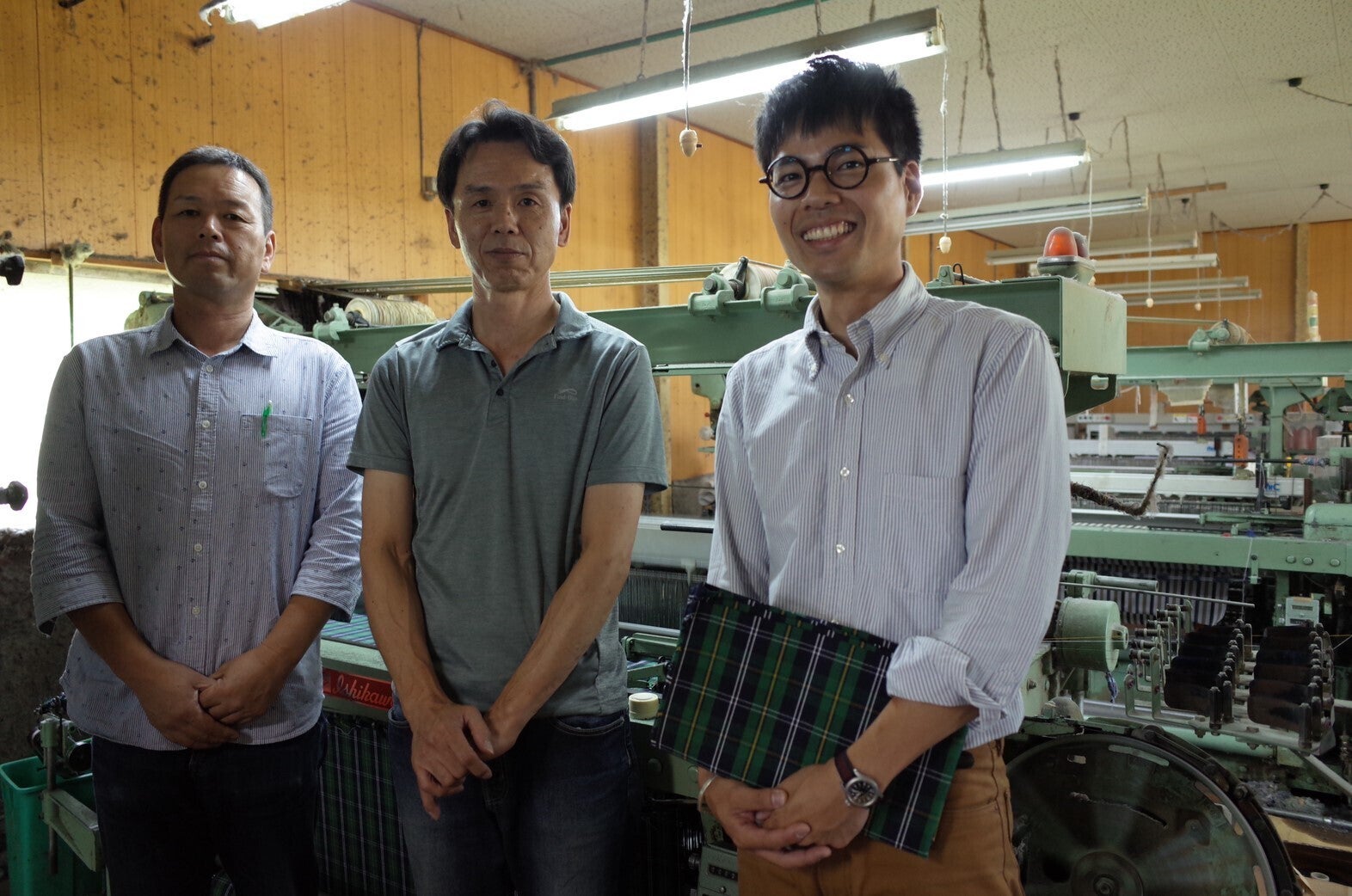 左から、播州織産元商社である泰久商店の重本さん、織布を担当していただいた幸成織布の宮崎さん。糸染めの工程から多くの職人さんの力を借りて、完成に近づいています。
