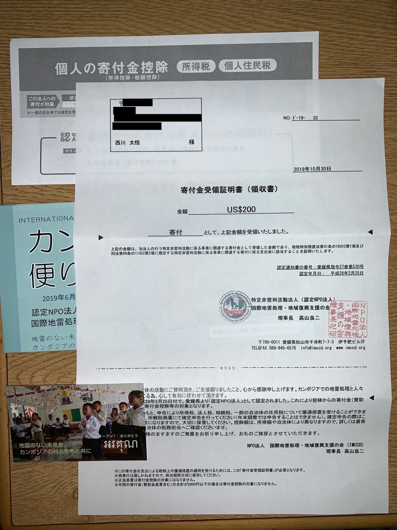 カンボジアで地雷除去活動及び地域復興活動をしている認定NPO法人IMCCD(国際地雷処理・地域復興支援の会)へ寄付いたしました事を報告させて頂きます。