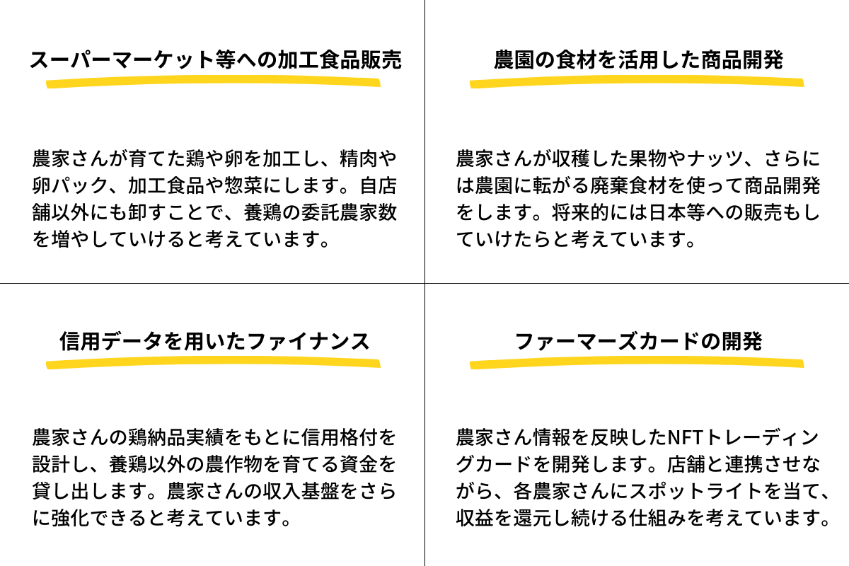 そして、フランチャイズのような形で養鶏導入農家さんを増やしていくことで、将来的にはアフリカ各国に委託養鶏(からあげと共に)を広げ、小規模農家さん5億人の暮らしに変革を起こしていきたいです。