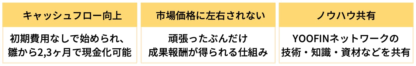 鶏舎やヒナ、餌やノウハウなど、鶏飼育に必要なものを農家さんに提供し、YOOFINへの鶏や卵の納品を通じて成果報酬型の支払いを行います。農家さんは初期費用なしで始められ、頑張り次第で委託養鶏数が増える仕組みです。