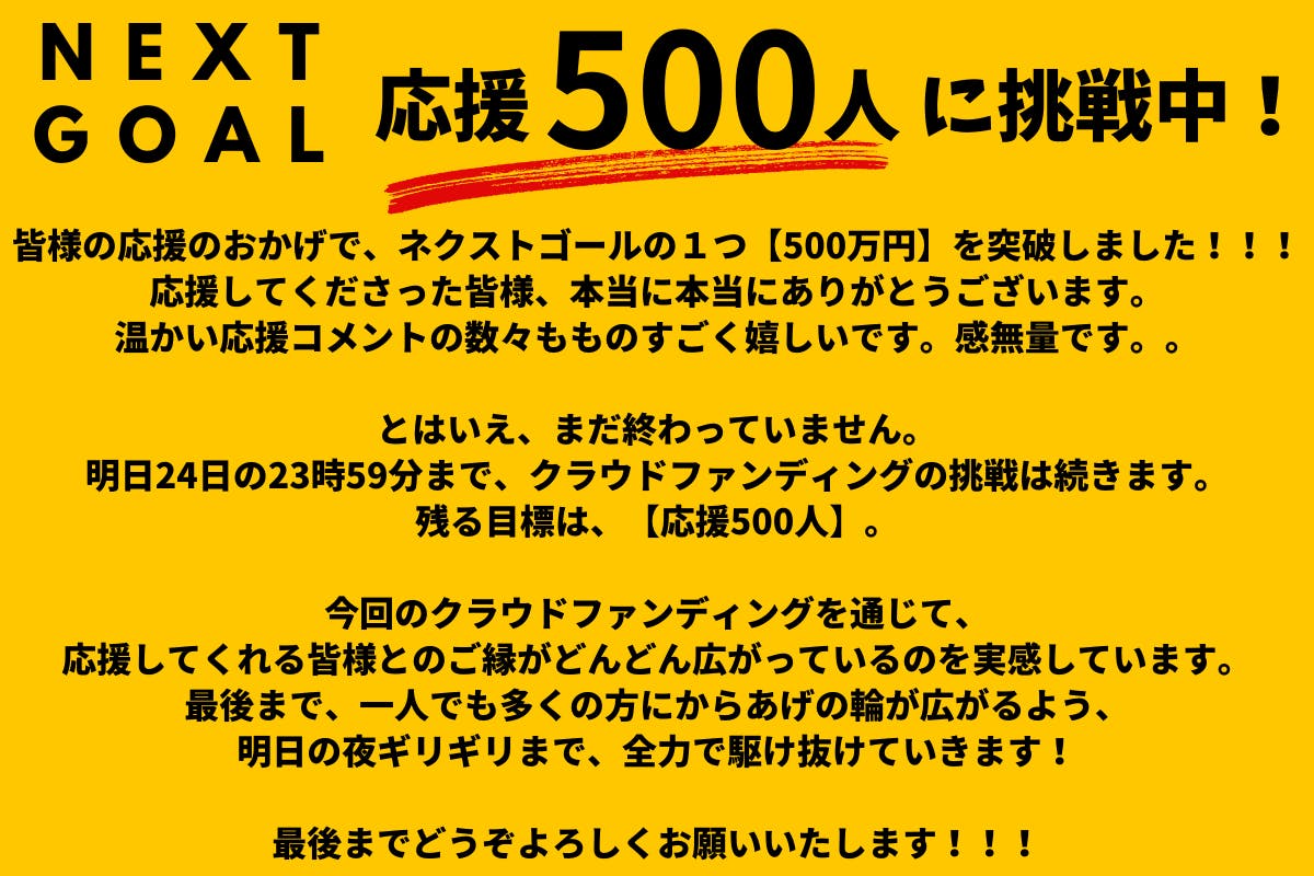 これ以外に人件費や各種費用を加えると、合計で500万円ほど必要となる見通しです。このうち第1目標として100万円(最大目標500万円)をクラウドファンディングで皆さまのお力をいただきたいと考えています。ぜひ応援していただけたら幸いです。