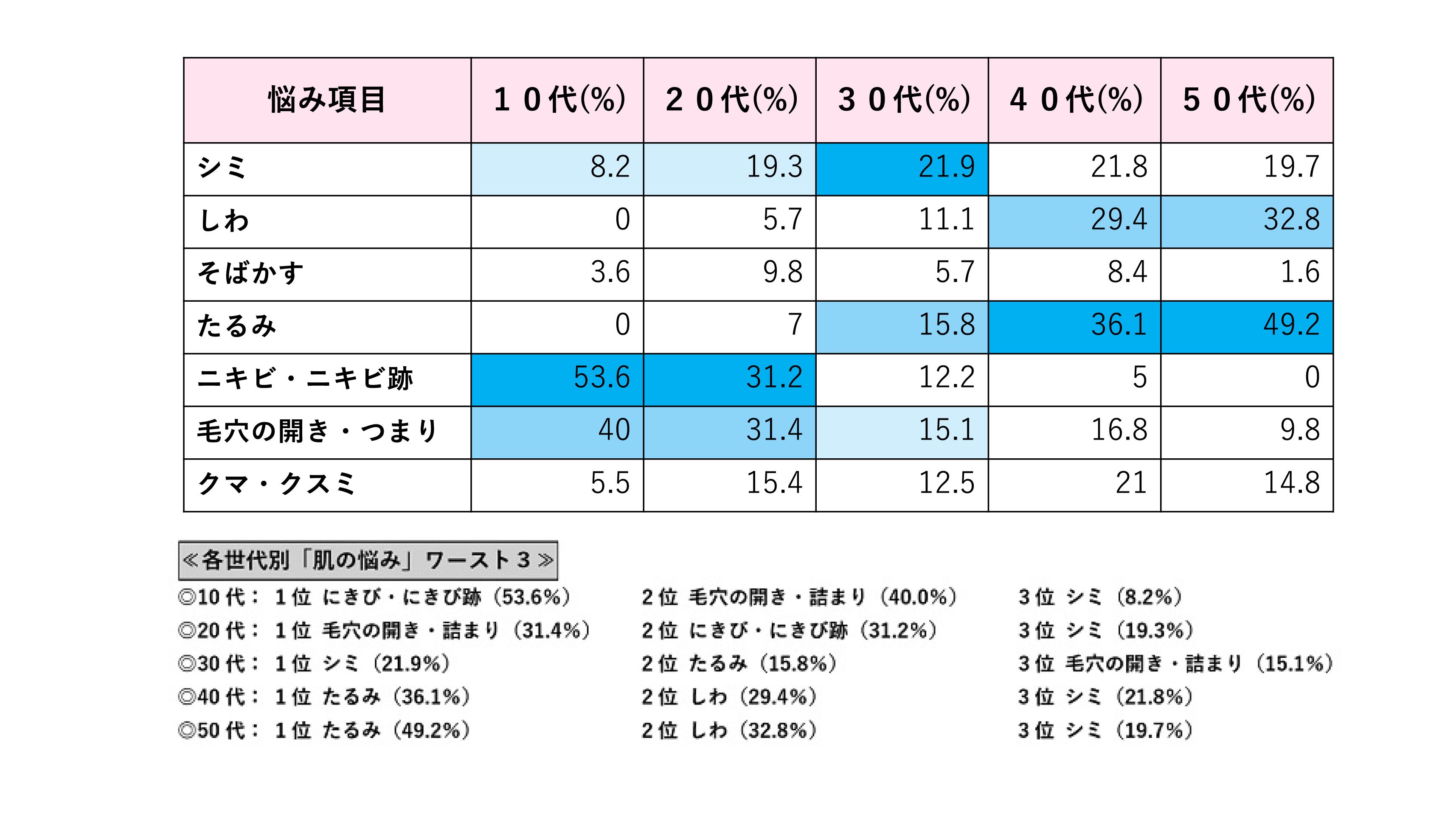 参考:美容外科東京イセアクリニック「10代~50代女性世代別『肌の悩み』2017年アンケート」