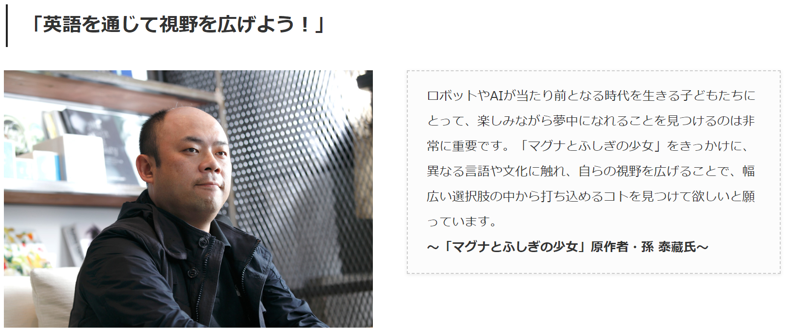 ロボットやAIが当たり前となる時代を生きる子ども達にとって、楽しみながら夢中になれることを見つけるのは非常に重要です。「マグナとふしぎの少女」をきっかけに、異なる言語や文化に触れ、自らの視野を広げることで、幅広い選択肢の中から打ち込めるコトを見つけて欲しいと願っています。