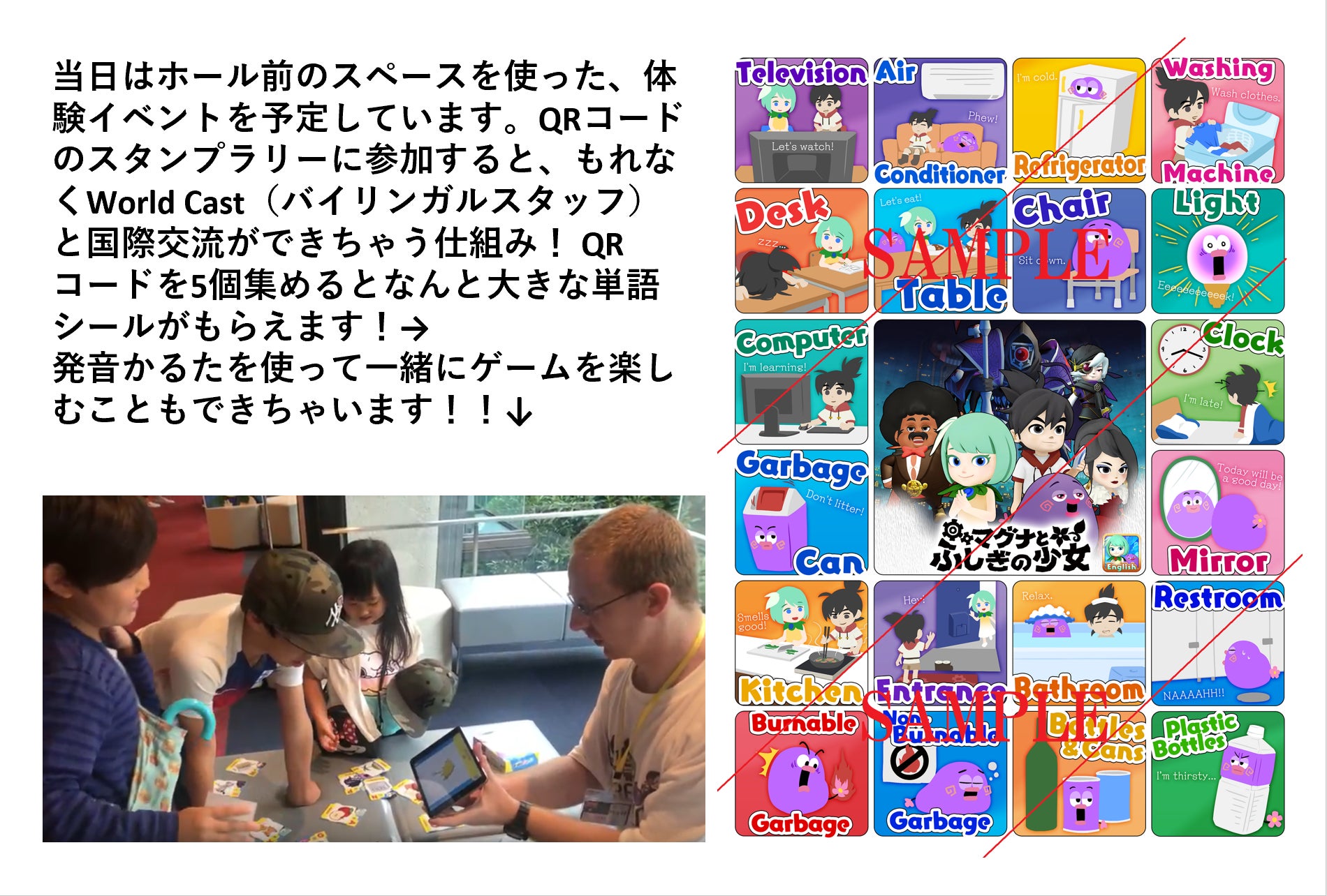 合計5つのQRコードをスキャンして集める遊びです。QRコードはWorld Cast が持っていますよ~。会場ロビー内でウロウロしているので「Do you have a QRcode??」と声かけてみてください。「Yeah! Let's try to answer the question ! 」などと、元気よく答えてくれるので、簡単な『Question and Answer』を楽しんでくださいね。