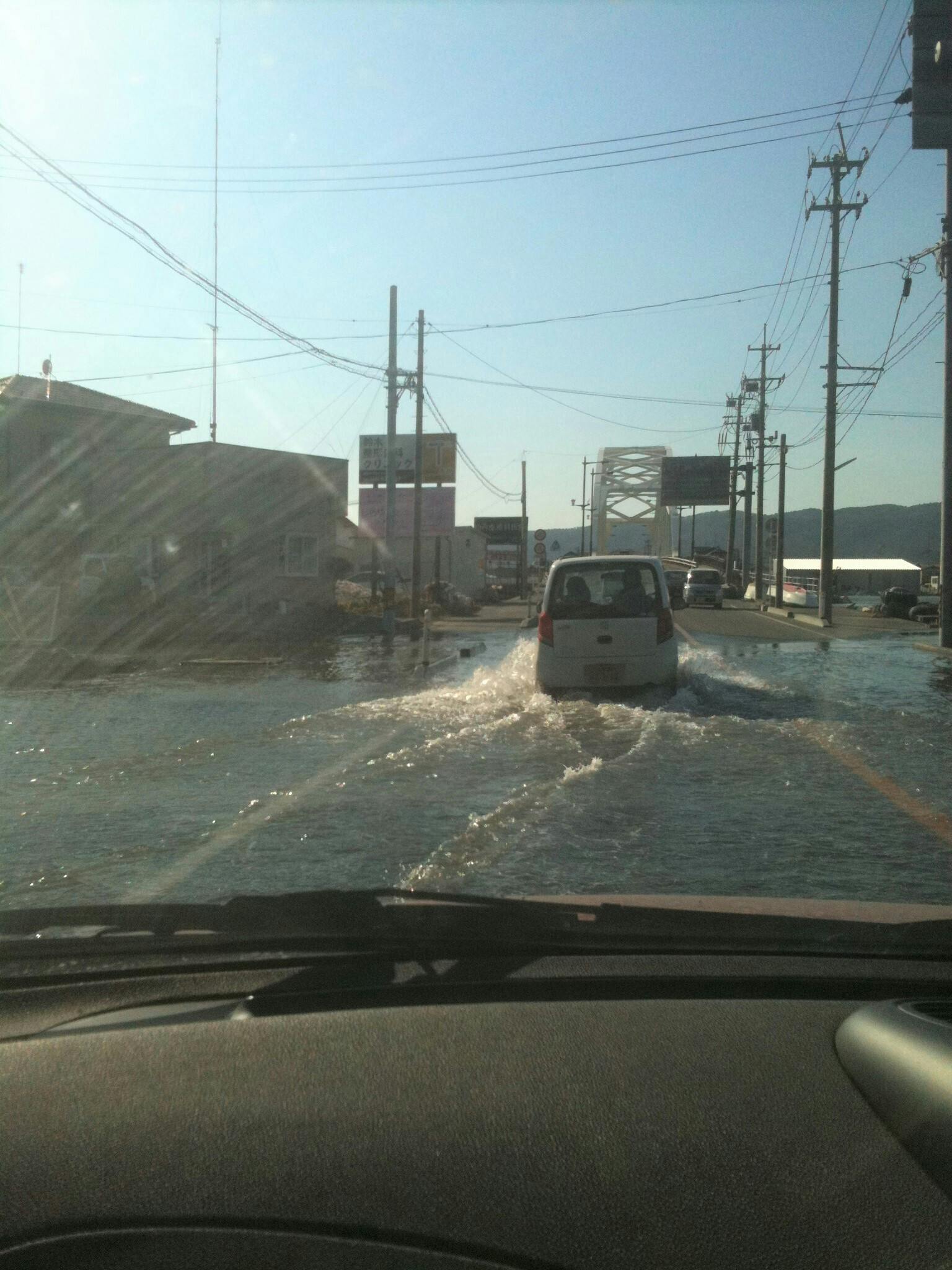 まだ水に浸かった道路、ひしゃげた標識など、震災の爪痕そのままの光景の中、避難所を見つけては、物資をお届けに。