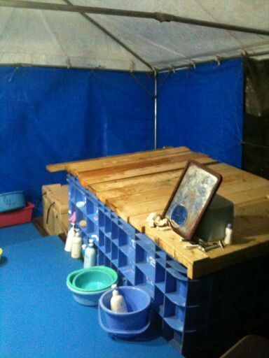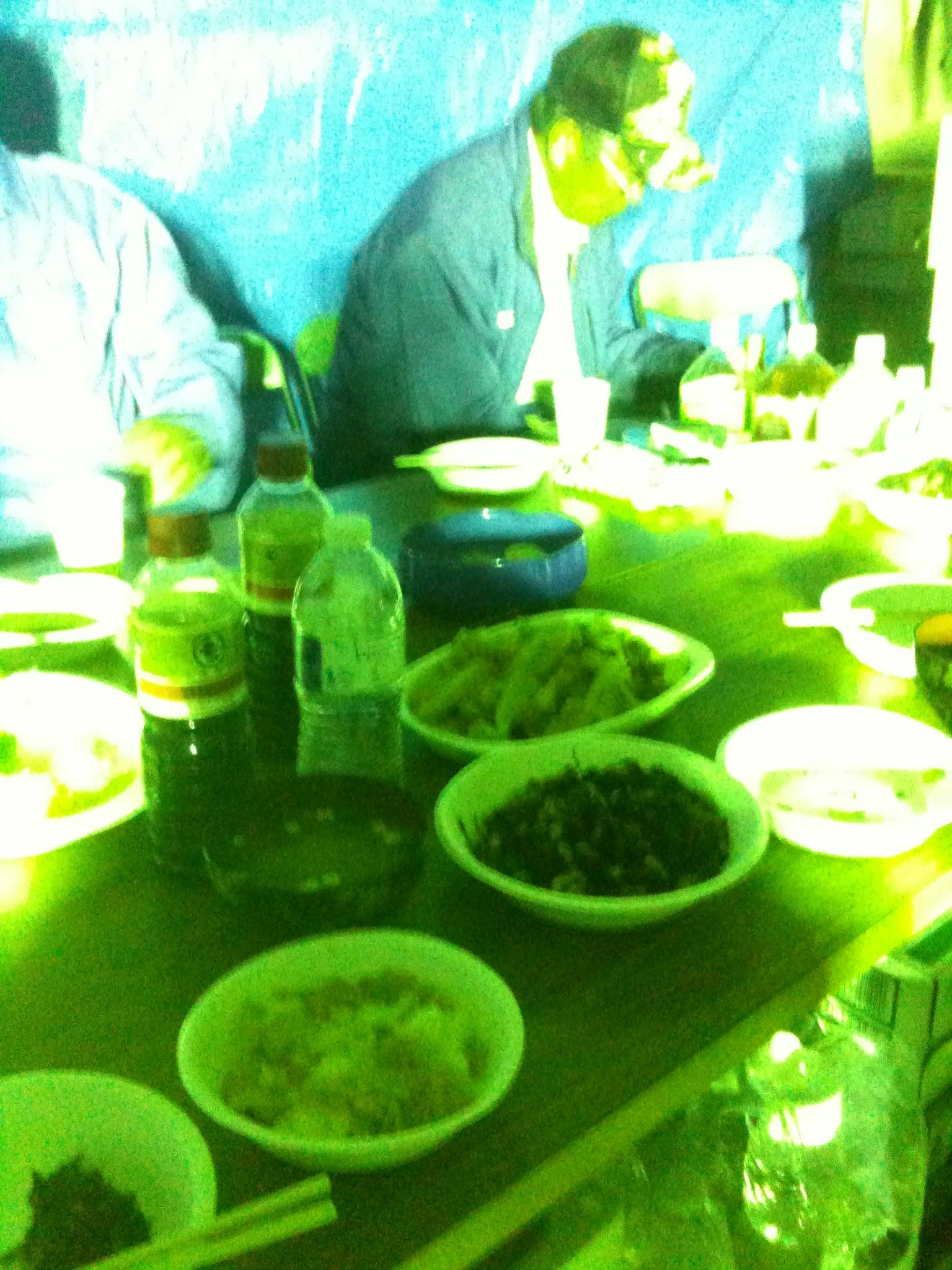 そこにはビニールシートで天井とサイドが囲われ、テーブルと椅子が並んだ特設の食堂が!救援物資のお野菜で作られた様々なおかずや、私たちが持ってきたお寿司やお刺身、そしてお酒が並んで、宴会が始まりました。