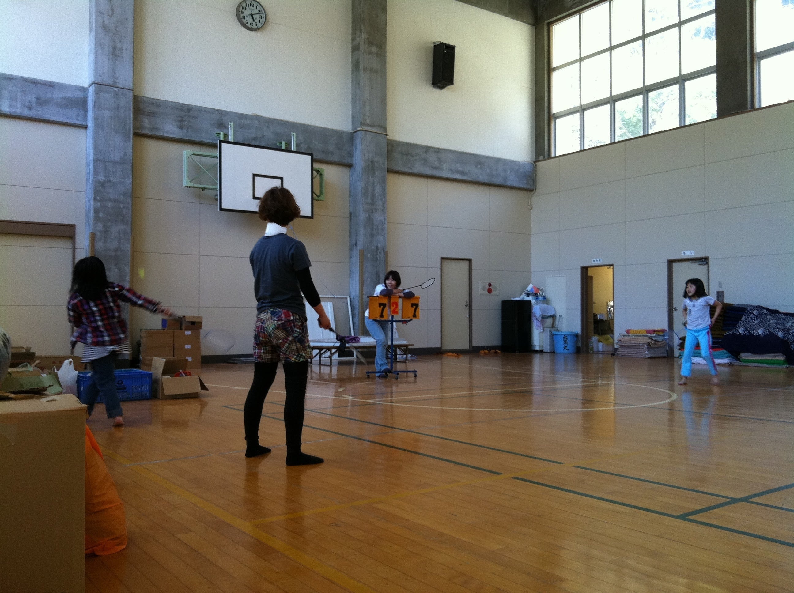 (体育館で避難している子供たちとバトミントン。