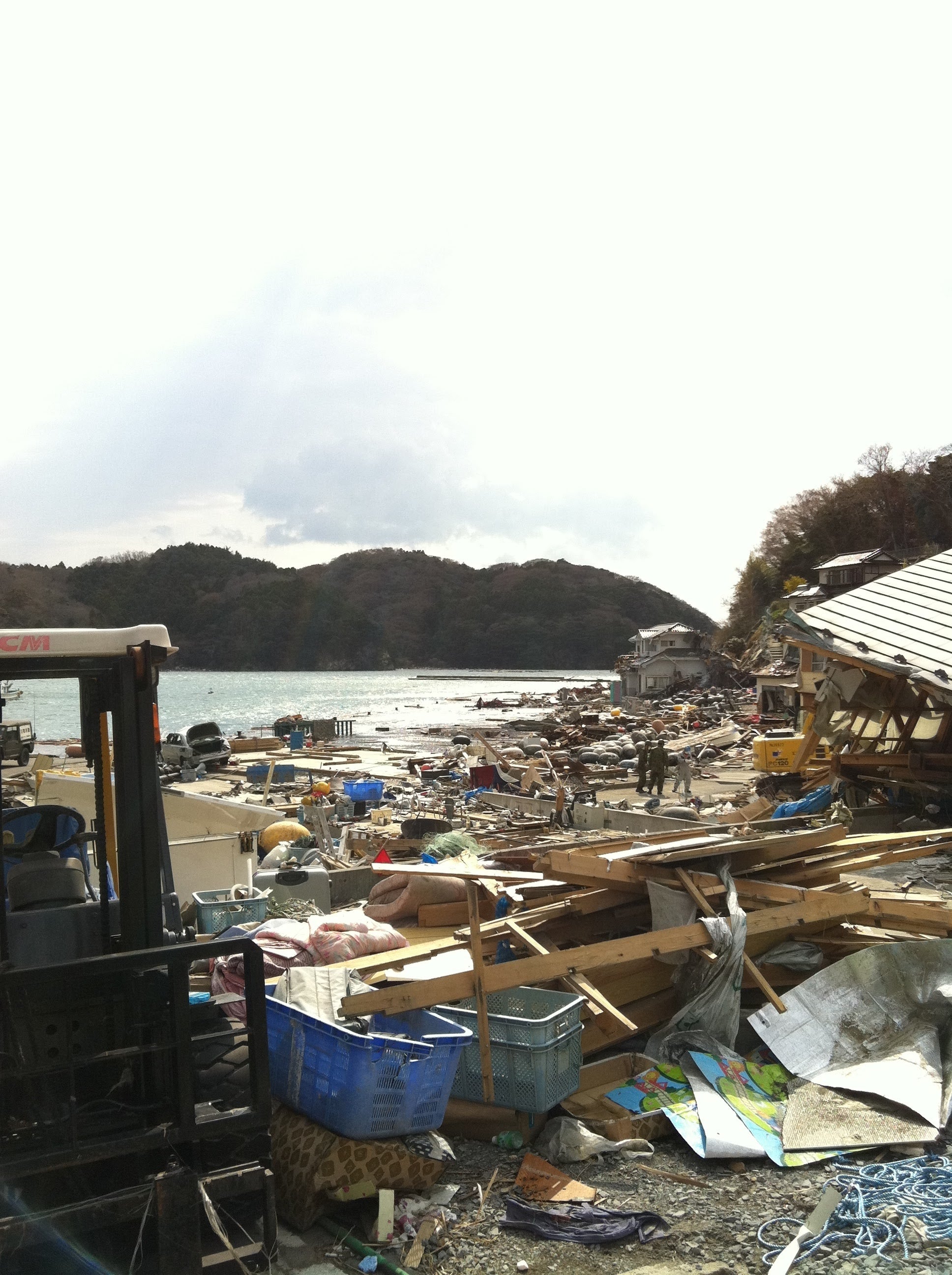 そんな思いを抱えながら「長居しても、、」とお暇させて頂きました。。持ってきた物資はもう配り切っていて、時間は17時近くだったでしょうか。夕暮れに染まった月浦漁港の美しさと容赦なく視界に入る瓦礫の山を脳裏に焼き付け車に乗り込んだ私たちは、あのおじちゃん達の言葉が忘れられず、しばし無言でした。