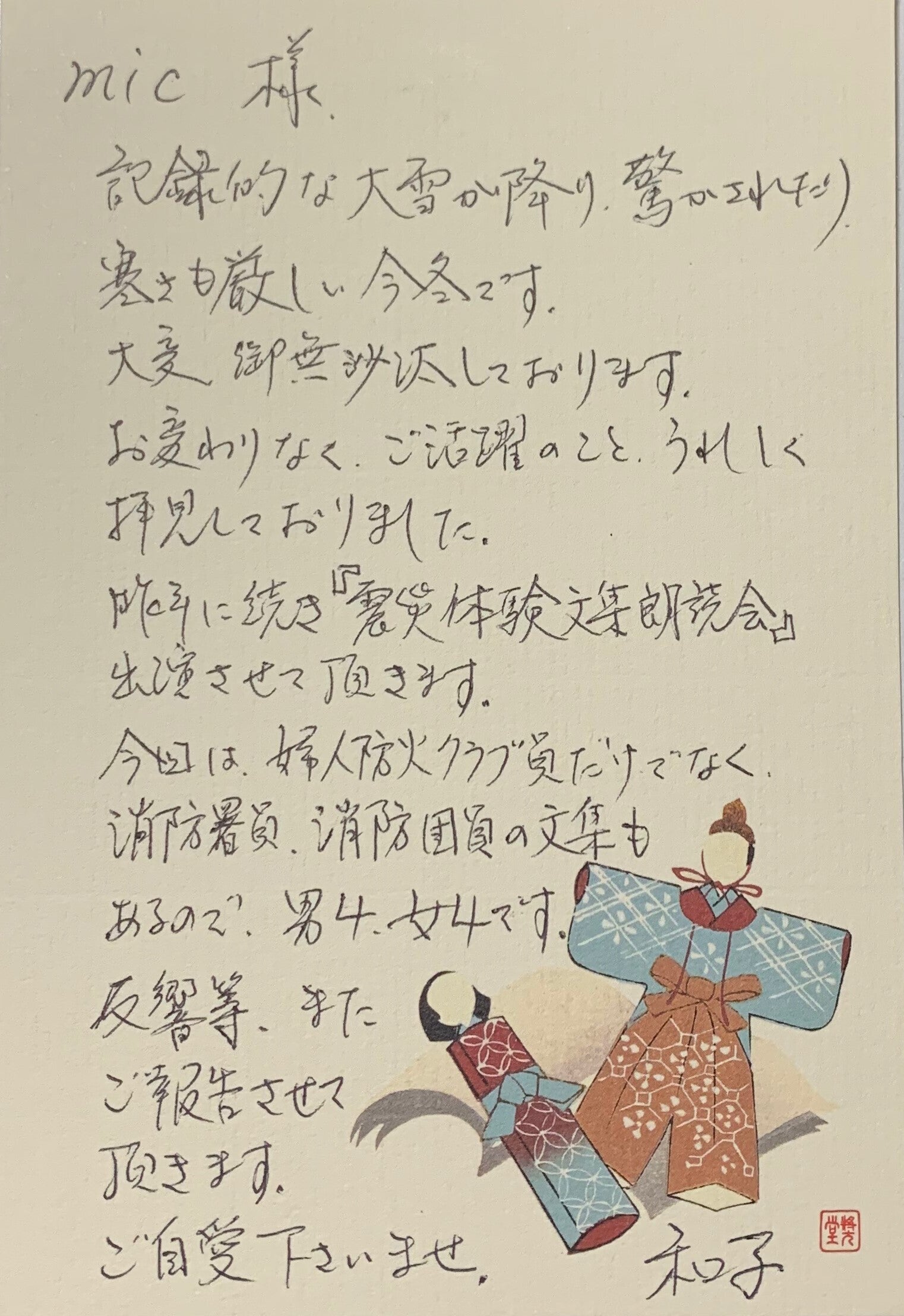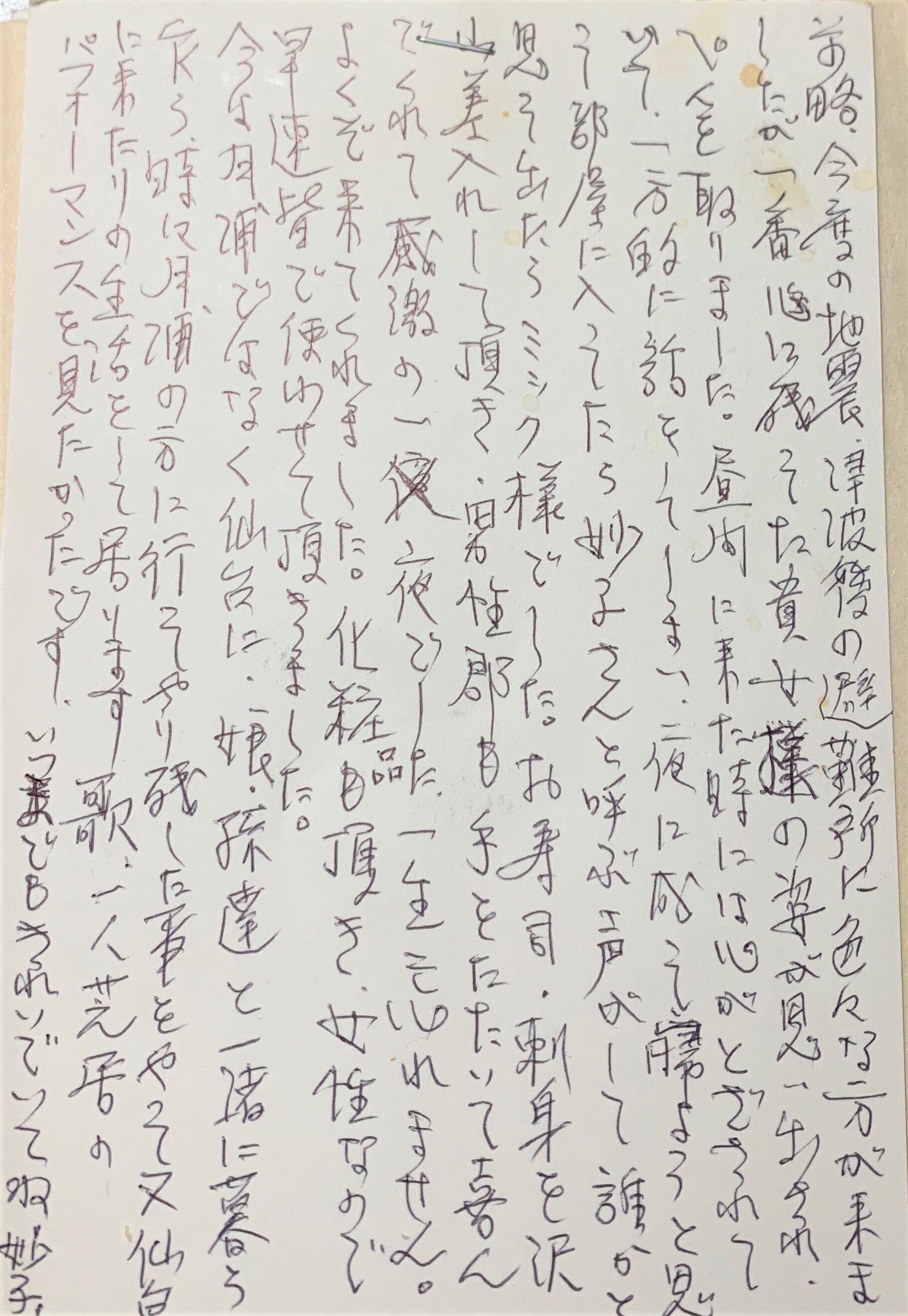 2021/03/31 15:00クラウドファンディングにご参加くださった皆さま大変ご無沙汰してしまいました。皆さま、いかがお過ごしでしょうか?今年の3月11日、東日本大震災から10年が経って思いもよらぬ環境の変化もあってそれぞれの想いを胸に迎えられた方も多かったのではないかと思っています。私自身はといえば、皆様になんとか3月11日までに特典のお渡しを、、と準備していたのですが今になってしまったこと、どうかお許しください。*****昨今のコロナ事情により映画界ではDVDやパンフレットの送付等は極力避け、オンラインでの受け渡しを行なっております。プロデューサーとも話し合って、私たちも動画・エッセイをオンラインにてお送りさせて頂くことにいたしました。(↑この設定に時間がかかったのです泣)******でも「やっぱりDVD、紙資料で欲しい!」という方もいらっしゃるかと思いますのでその方はご遠慮なくご連絡くださいませ。宛先:mic39cat@gmail.com タイトルにDVD・用紙に希望本文:お名前・ご住所・お電話番号*******お待ちかね!? クラファン特典映像!まず先にお楽しみ頂きたいのは舞台の模様をまとめたこちらの映像です!「mic、”徹子micの部屋”に出演!?」https://www.youtube.com/watch?v=_UZrXrFRhuA(画像をクリックしても飛べますよ!)*特典映像の限定公開youtubeゆえ転送はお控えください*エンドロールのお名前は1万円の方のみです(^^)******さあエッセイ、スタート!どうかお楽しみ頂けますように。*先にDVDをご覧になって本編をお読み頂くのがおすすめです<目次>1:はじめに2:石巻で出逢った方たち 矢口龍汰さん、三國裕子さん、小林四十さん 石川光晴さん3:さいごに4:石巻公演をご覧くださったお客様からのコメント5:おまけ(見てのお楽しみ!)■はじめに今、思えばどれほど幸せだっだろう 2019年11月2日、第4回いしのまき演劇祭。2011年の東日本大震災以来、何度も何度も訪れた場所。ボランティアから始まって、そこで出逢った人たちにただ会いたくてまるで里帰りするように何度も訪れたもうひとつの故郷。やっと念願の”役者”としてこの地を踏むことができた、あの嬉しさ。石巻の劇場で、満員のお客様が笑って泣いてくださったかけがえのないひととき。あの時間があったからこそ今の私があり、なんとか役者を続けられているのだと思う。2019年11月2日に上演された「ひとりコーラスライン(笑)!」石巻公演。もしこれがこれが4か月後だったら、コロナの状況下で間違いなく石巻に行くことはできなかった。そして、そもそもクラウドファンディングでの皆さんからのサポートがなければ実現できなかった。改めて本当に恵まれていた。その感謝を込めて少しでも皆さんが石巻公演を追体験してくださればと私が感じたアレコレを綴ってみたいと思うどうか、ほっこり、お気に入りのドリンクやらお酒片手に読んで頂けたら幸いです。******と、2020年の初めに書き始めていた。しかし、事態がコロコロと変わり、コロコロがコロコロしだした。生活も気持ちもコロコロ、演劇をする・見ることが普段の日常も日常じゃなくなった。そんな状況で、クラファン特典のエッセイに”3密”が当たり前だったあの石巻公演の様子を楽しくレポートするという、それで果たしていいのだろうかと私は立ち止まってしまった。書き終えて「あぁ、あの頃は楽しかったよね、そんな日がまた来るといいよね」みたいな感じで締めくくるのはなんだかすごく切ない。そしてキーボードを前に何も打てなくなってしまった。これまでの私の仕事は全て3密で成り立っていた。何をするにも目の前にお客様がいた。というわけで一気に仕事がなくなった(笑)いや、もう笑うしかないくらい。でも仲間やプロデューサーが声をかけてくれたりリモートオーディションに受かったり関係者のみ観客の舞台やオンライン生配信舞台への出演など、結果、私はコロナの中でずっと芝居をし続けていた。で、勢い余って年末にはふたり芝居公演までやってしまった。めっちゃやってるやん!なんならいつもよりやってたんじゃないか(笑)そして、皆さんをお待たせしたまま2021年が明けた。その間、ずっとどうすればいいか心の隅で考えていた。だんだん気持ちの整理もついてある想いが浮かんだ。単に石巻で出逢った魅力的な方々をご紹介するのではなくこのコロナの中、その方々がどのように過ごされていたのかお伝えすることで読んでくださる皆さんに何か感じて頂けるのではないだろうか。って、前置き長い!(笑)■石巻で出会った方たちクラウドファンディングにご参加くださった皆様には私がどのような想いで石巻で公演したかったのかお分かり頂けていると思う。*もう一度おさらいしたい方は⇨クラファンサイト https://camp-fire.jp/projects/view/193983私たちの目指すゴールは、第4回いしのまき演劇祭にて「ひとりコーラスライン(笑)!」を上演し震災から交流を続けてきたおじいちゃんおばあちゃんに私の舞台を見てもらうこと。ただ、それだけだった。だったはずが、