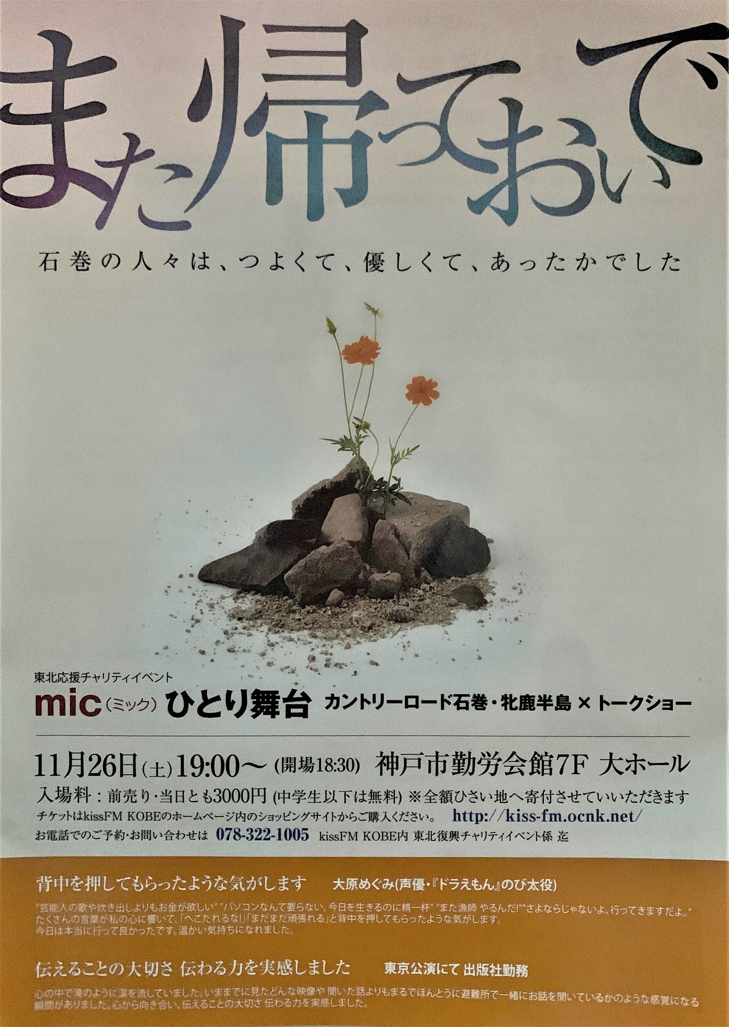 私はすぐにスタッフチームに連絡を取った。いしのまき演劇祭に応募したい旨を伝えた。「私は自分の作品で石巻の人たちに元気になってもらいたいとか、このメッセージを届けたいなんて気持ちは正直なくて、ただ、あの妙子さんご夫婦や娘さん家族、避難所で出会って、いつかmicの芝居を見たい。と言ってくださった人たちに見てもらいたい。そんな理由なんだけどどう思う?」誰もが「行きましょう!」と即答してくれた。「でも、もし受かったとしても会場費はいらないけど交通費や宿泊費、その他の経費は全部こちらで負担しないといけないねん、、涙(弱気になると出る関西弁)
