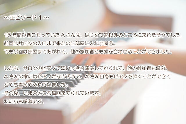 「参加してよかった」「こんなに楽しかったのは久しぶり」「是非、長く続けて欲しい」「明日からまた生きていける」などのメッセージをいただき、