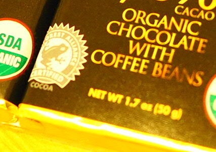 カエルがデザインされたマーク、レインフォレスト・アライアンスは社会、経済、環境という3つの柱にわたる持続可能性を要求しているものです。